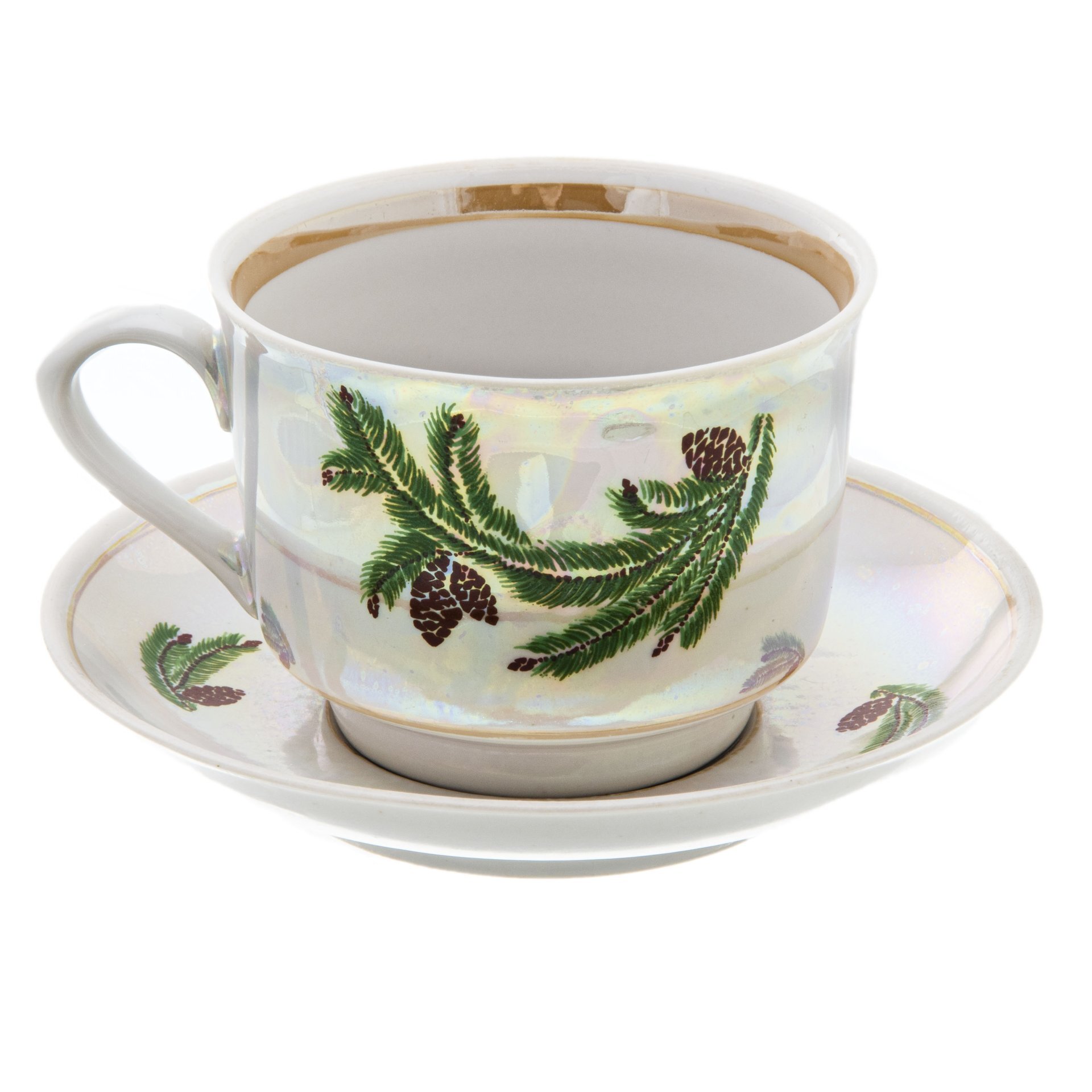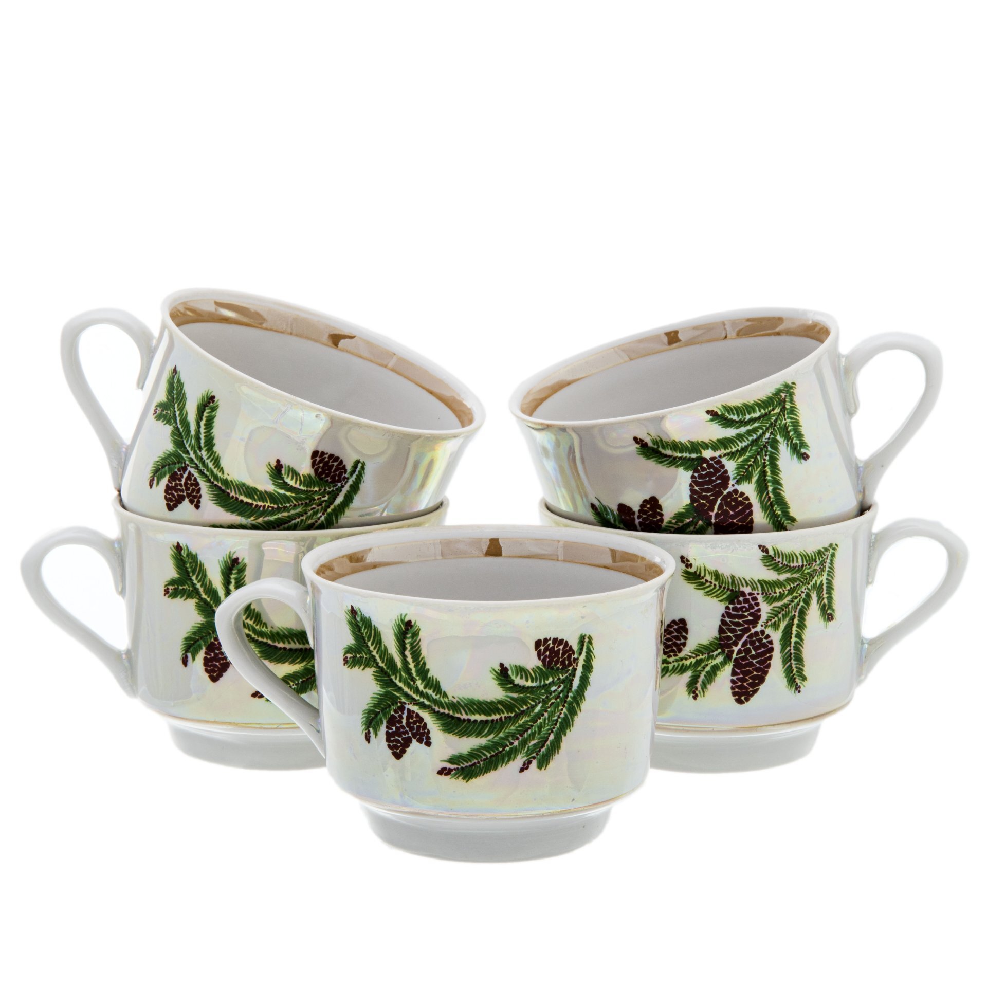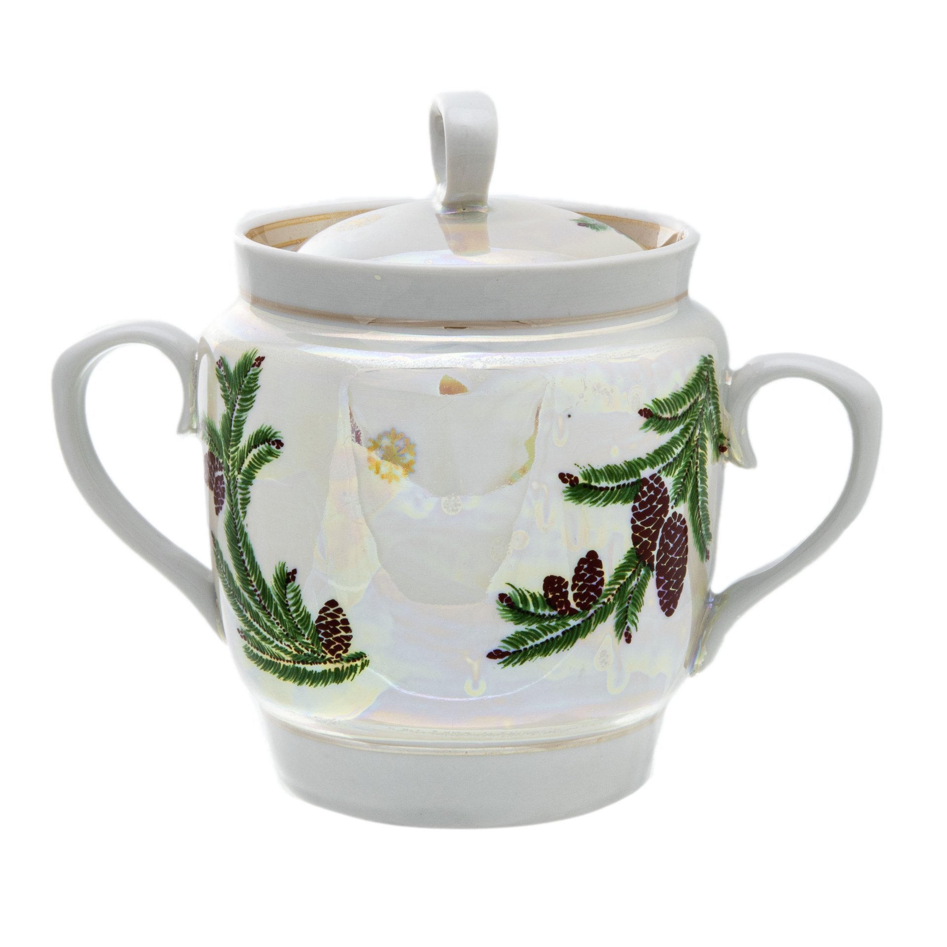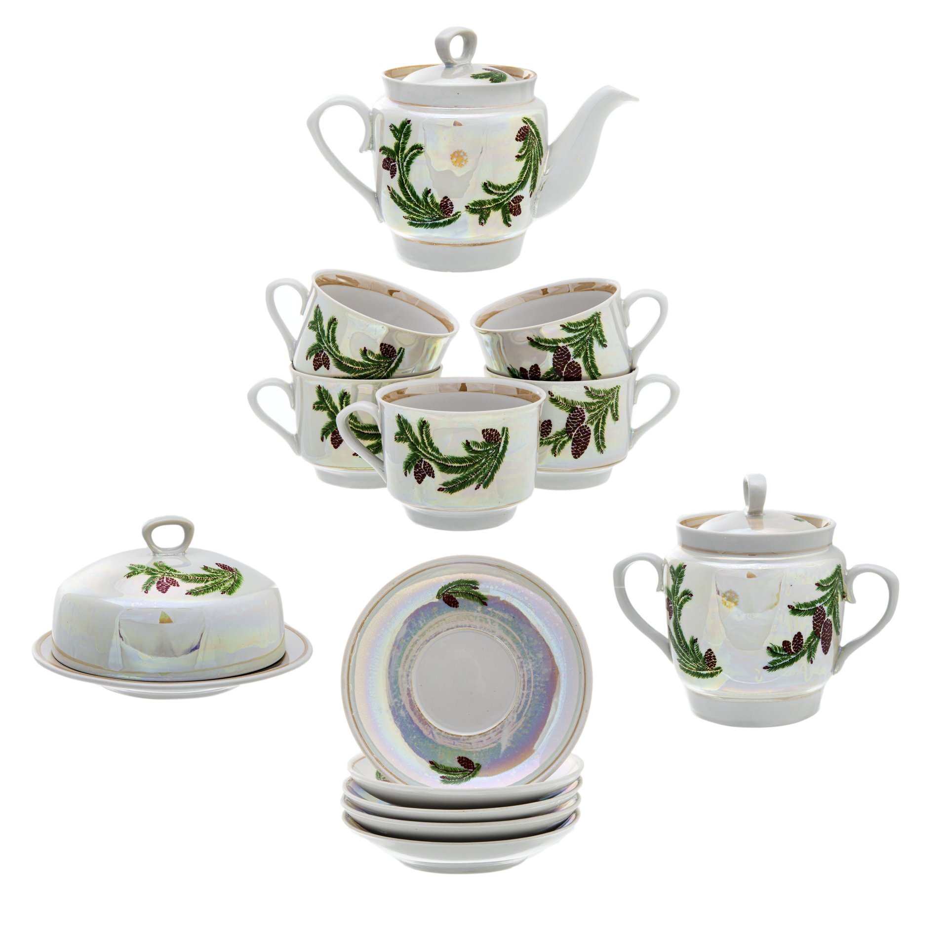 Сервиз чайный на 5 персон "Еловая ветка"состоит из:1) заварочного чайника, размерные характеристики: ширина - 86 мм, длина - 185 мм, высота - 127 мм, объем - 500 мл, вес - 448 г;2) сахарницы, размерные характеристики: ширина - 86 мм, длина - 153 мм, высот