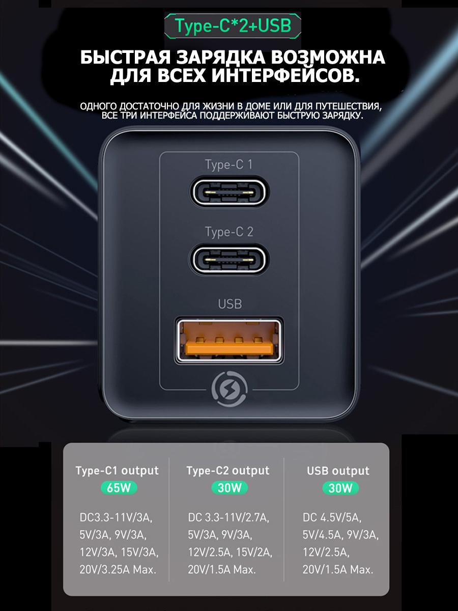 ОсобенностиЗащита от перегрузки по току, Защита от перегрева, Быстрая зарядка Power Delivery, Защита от короткого замыкания, Защита от высокого напряжения, Защита от низкого напряжения, Быстрая зарядка QC3.0, Двухсторонние порты