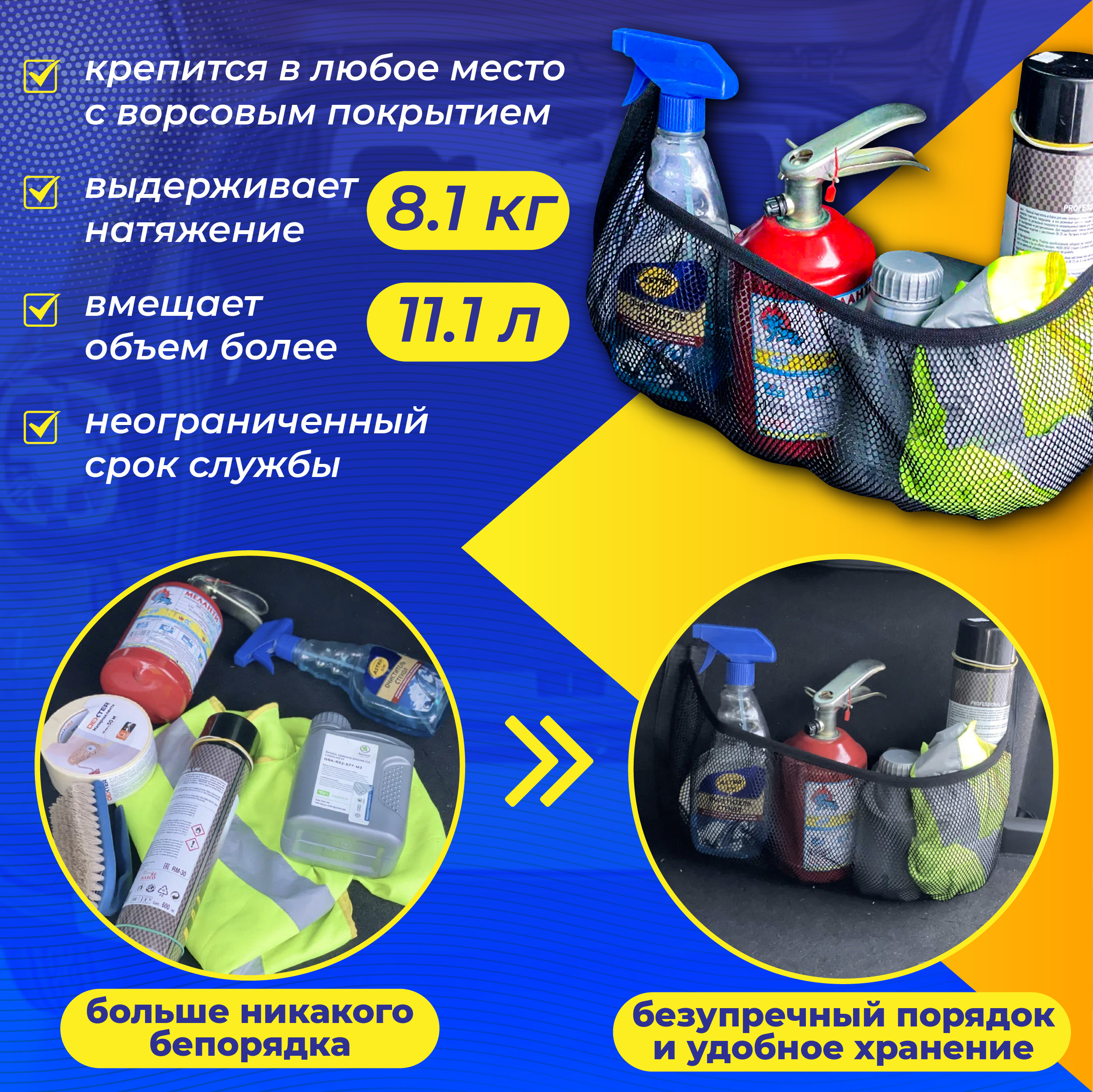 Сетка-органайзер в багажник автомобиля с усиленной липучкой подходит для любых автомобилей с ворсовым покрытием. Сетка предназначена, чтобы обеспечить чистоту и порядок в багажном отделении автомобиля. В данную сетку-органайзер можно сложить достаточно бо