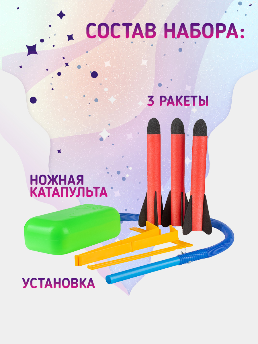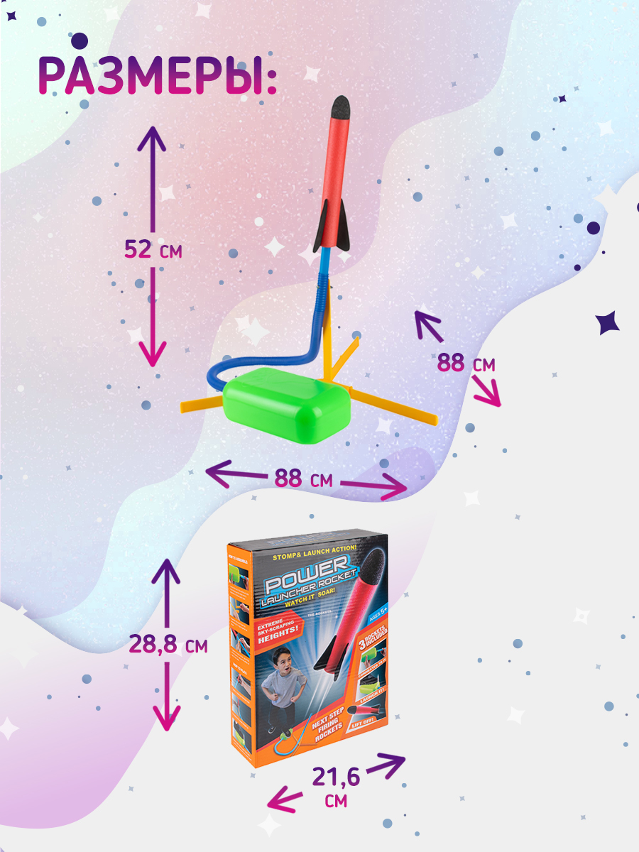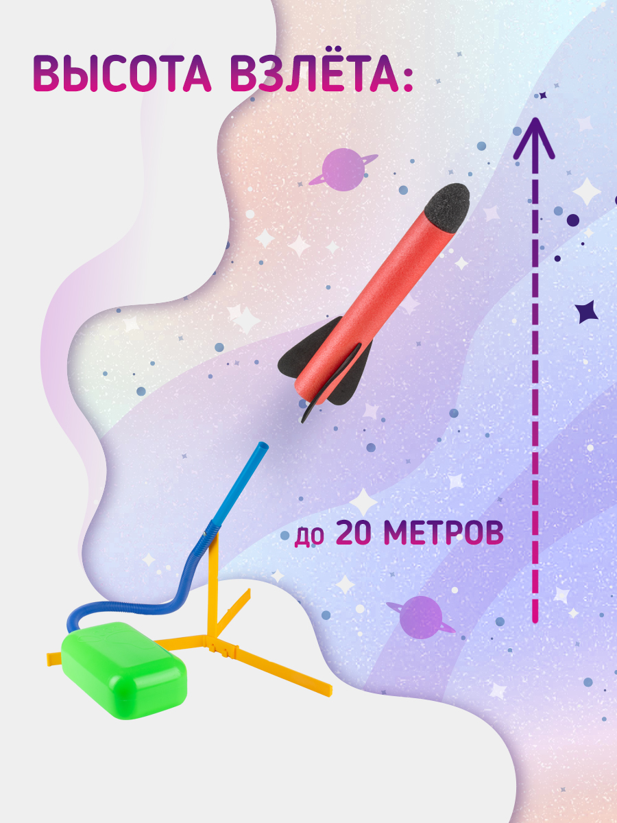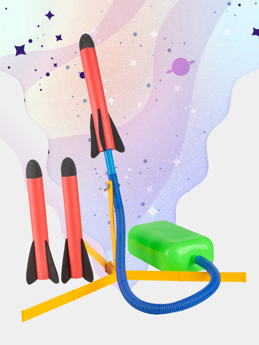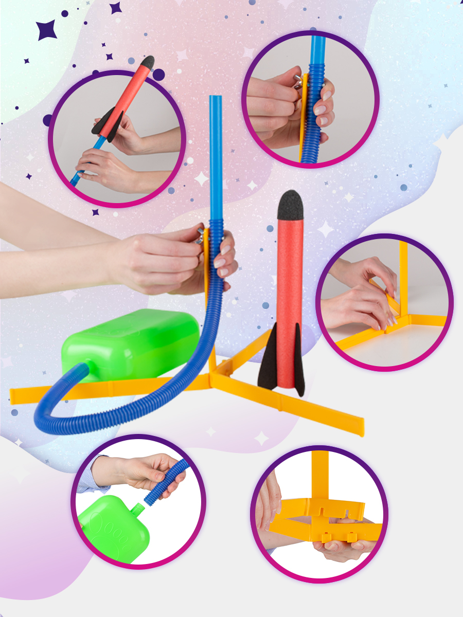 Оригинальная ракетная установка с пусковым устройством порадует не только детей, но и взрослых!Масса эмоций и веселья обеспечены!Ракетная установка очень проста в использовании:1. Нужно собрать подставку;2. Присоединить трубку и насос;3. Установить ракету