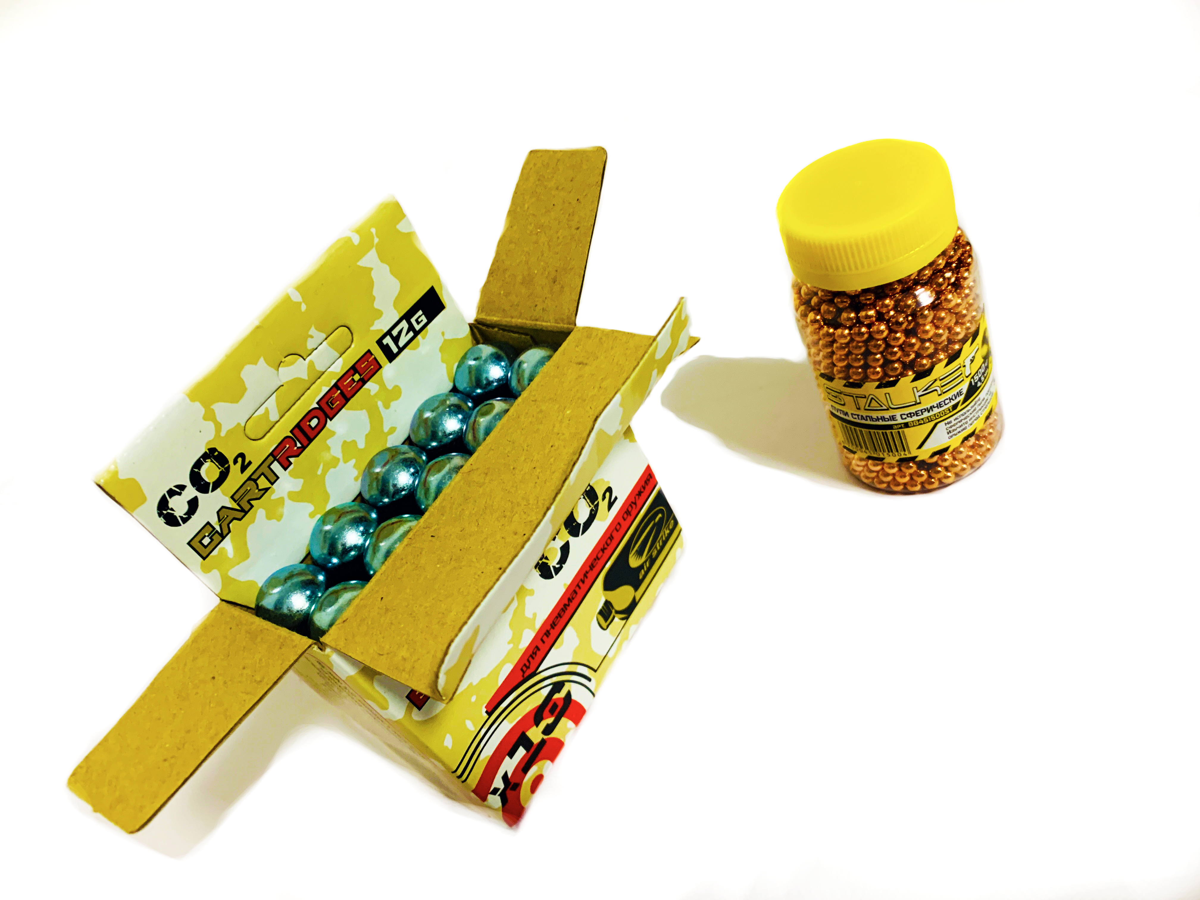Комплект для стрельбы из пневматического оружия. В набор входит упаковка 1500 шариков для пневматики диаметром 4.5 мм и Упаковка из 10 баллонов СО газа 12 гр. Пульки металлические с омеднённым покрытием. Все пули шлифованные и не имеют дефектов. одного ба