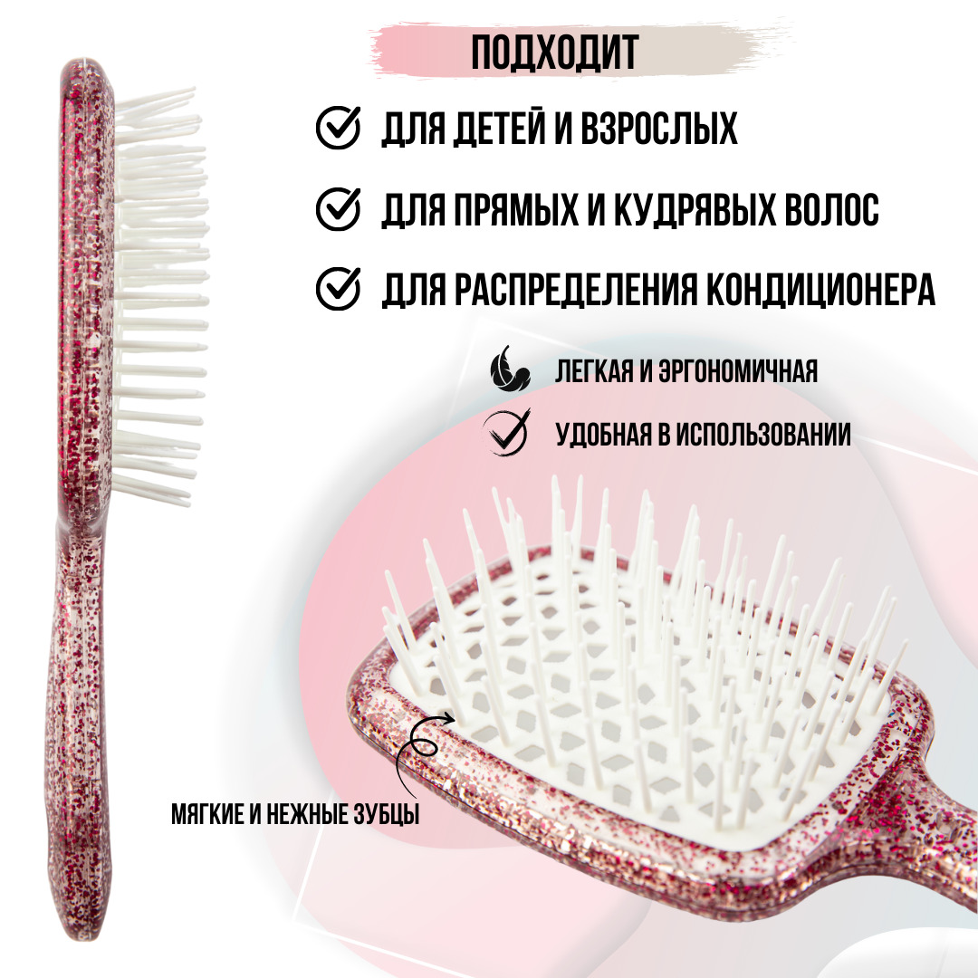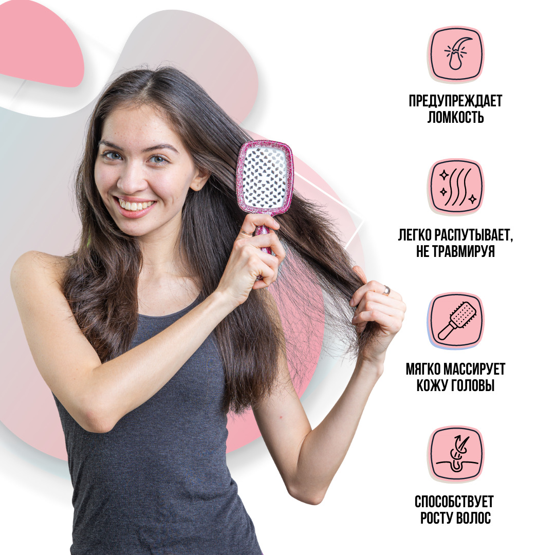 Массажная, продуваемая расческа-щетка для волос.Идеальная расческа для распутывания волос, любого типа. Обладает большой прочностью и гибкостью, подходит как для влажных, так и для сухих волос.Специальные вентиляционные отверстия в щетке, ускоряют сушку в