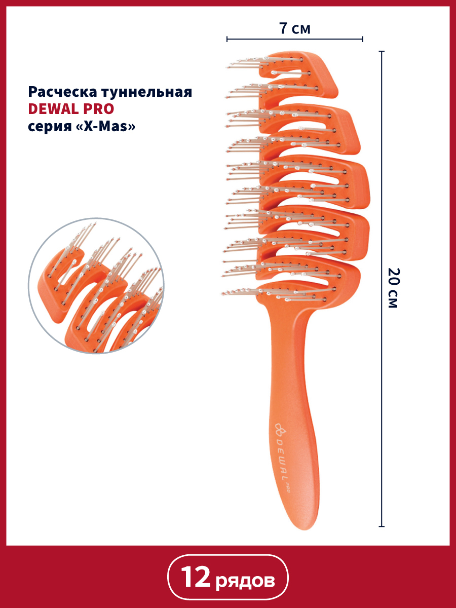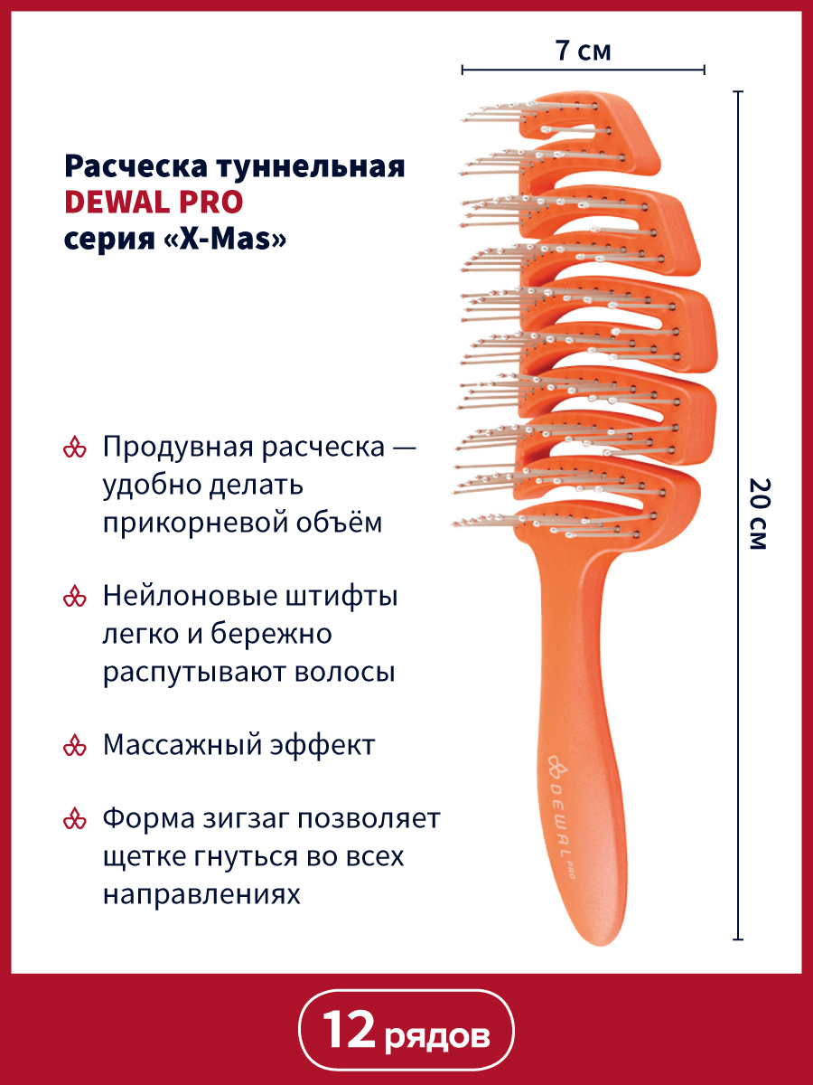 Щетка туннельная DEWAL BRX1 из серии "X-MAS" выполнена из высококачественной пластмассы. Форма зигзаг позволяет щетке гнуться во всех направлениях.Нейлоновые штифты мягко и бережно расчешут Ваши волосы, не повреждая и не запутывая их. Такой щеткой удобно