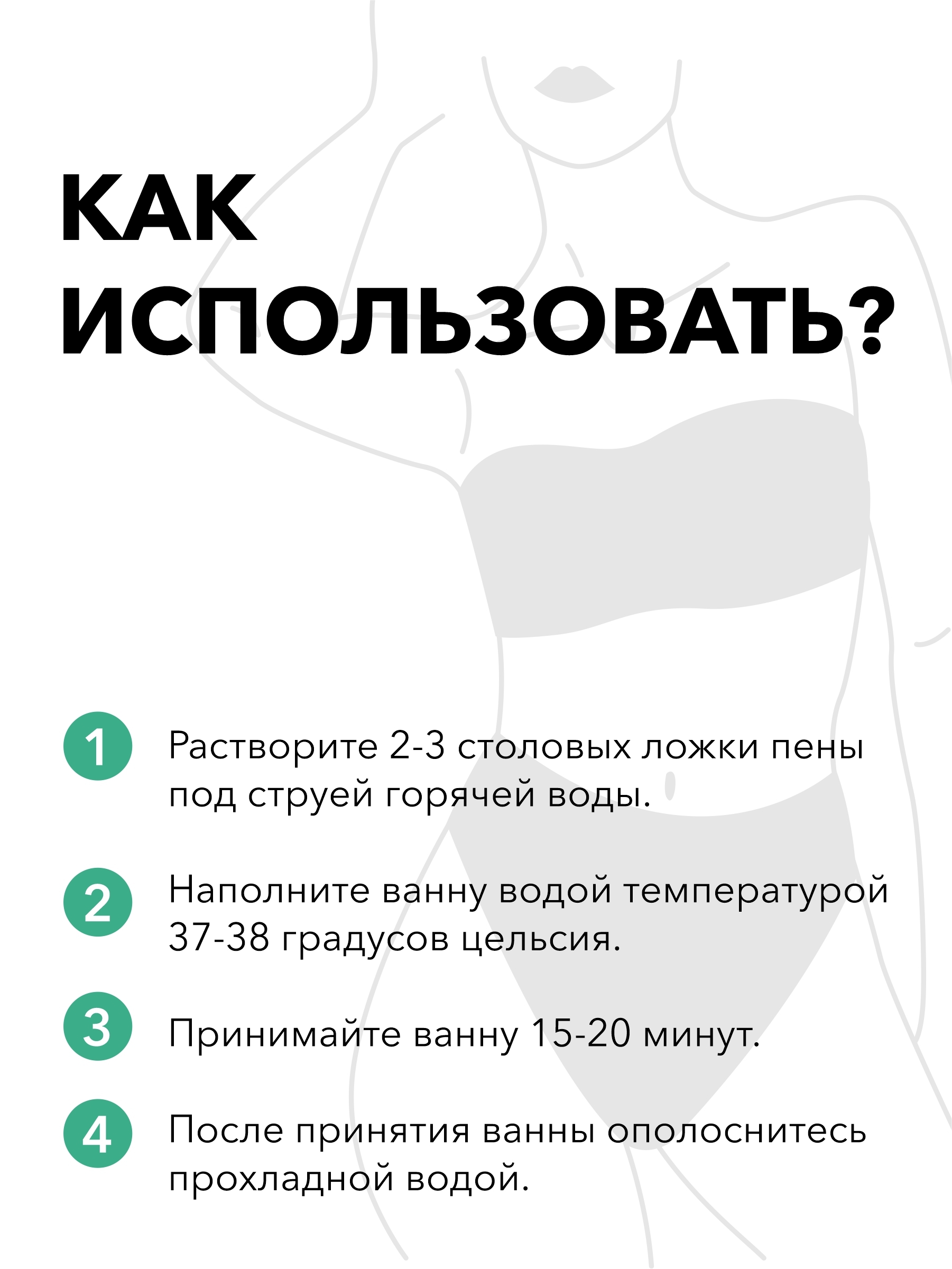 Способ применения:Во время наполнения ванны поместите 2-3 столовые ложки пены под струю воды. Принимайте ванную не дольше 15-20 минут. После ополоснитесь прохладной водой.Состав:Sea Pink Salt, Sea Water, Lauryl Glucoside, Disodium Cocoamphodiacetate, Coco