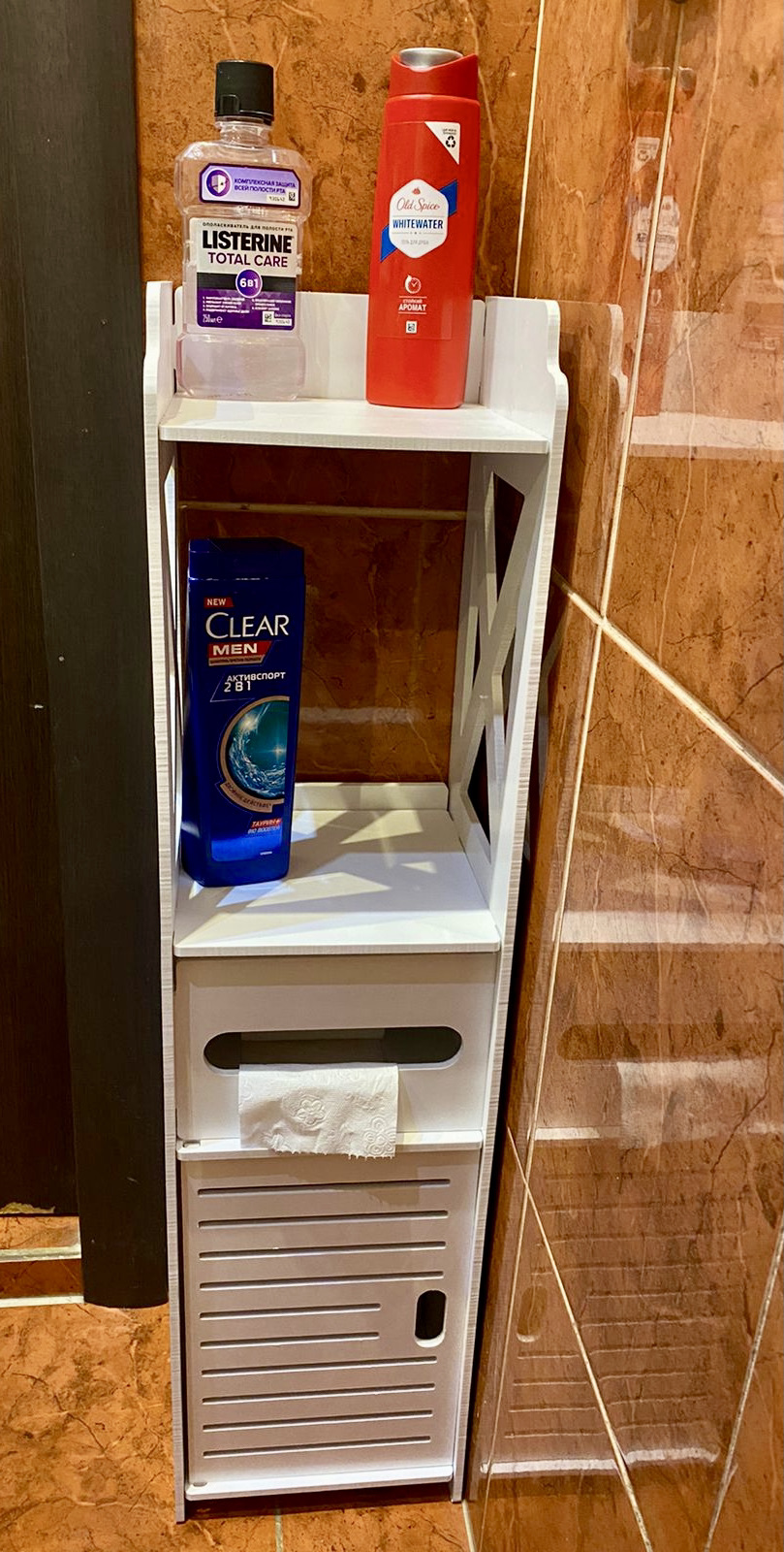 Конфигурация держателя для туалетной бумагис полкой, с подставкой для дезодоранта, с накопителем для рулонов, с крышкой
