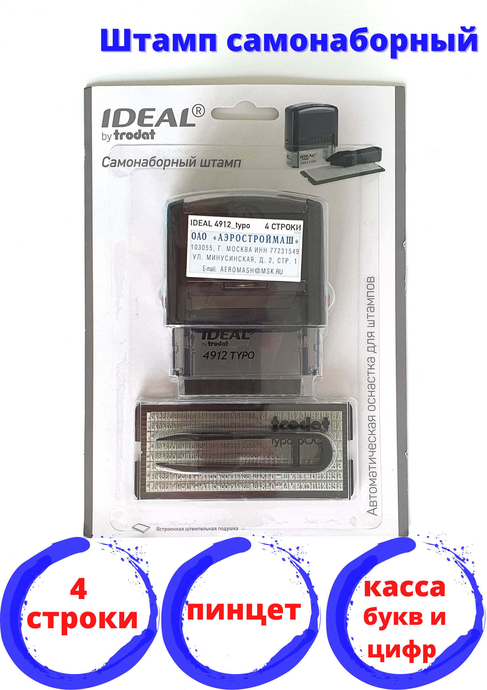 Самонаборный штамп - автоматический пластиковый 4-строчный штамп со встроенной штемпельной подушкой . Позволяет при необходимости оперативно изменить текст самонаборной печати . Прозрачное окно сверху штампа самонаборного предназначено для размещения текс
