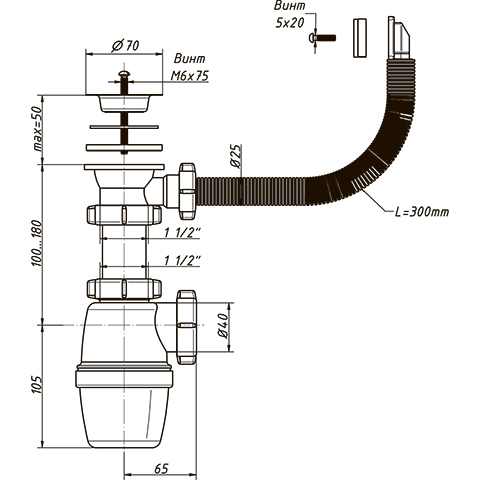 Сифон с большим корпусом и отстойником, прямоугольным переливом, выпуском, нержавеющей чашкой д.70мм для мойки с прямоугольным переливом. В комплекте две прокладки на перелив - для круглой и прямоугольной формы мойки.