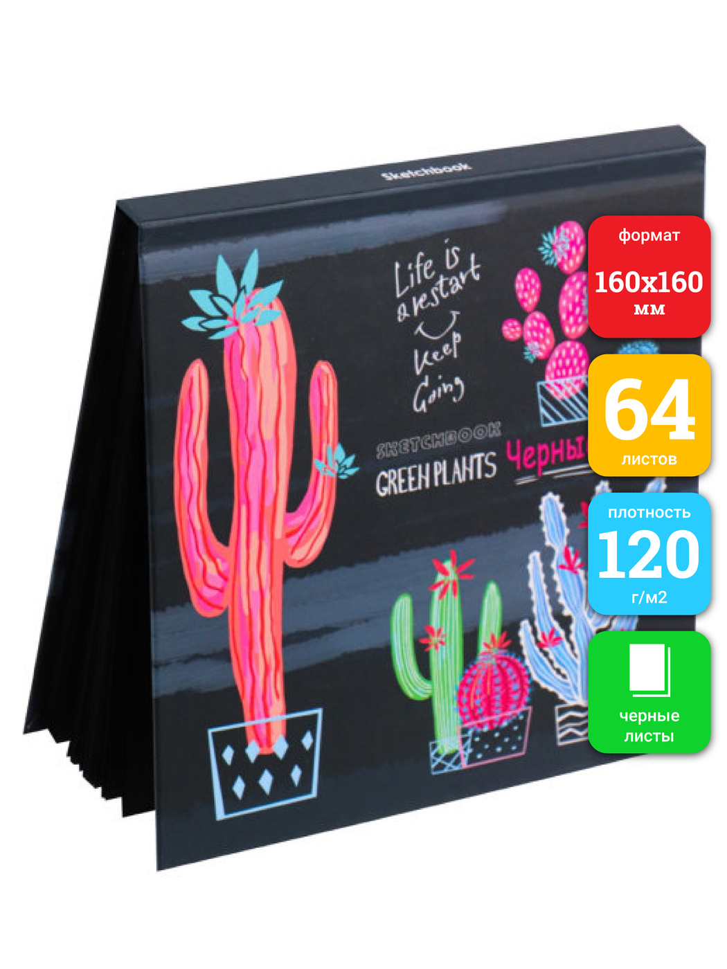 Скетчбук, prof-press, разноцветные суккуленты, 64 листа, жесткая подложка, обложка 7БЦ, плотность бумаги 120 г/м2, черный блок. Подходит для рисования цветными и чернографитными карандашами, линерами, гелевыми ручками. Размер 160Х160мм.