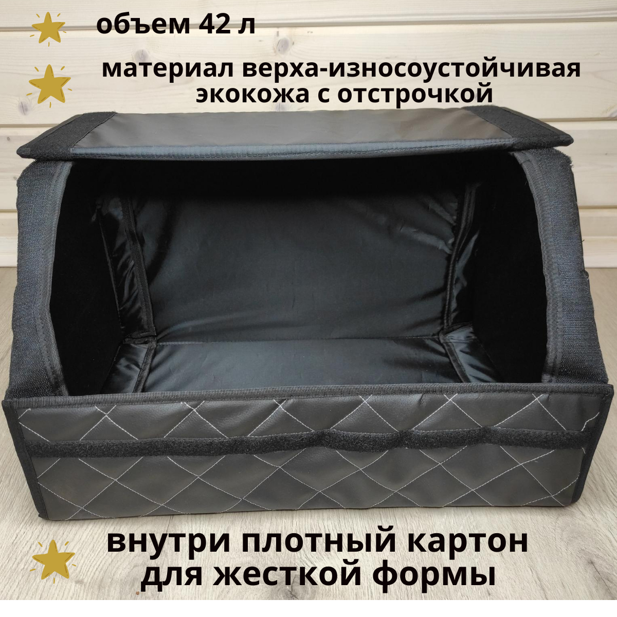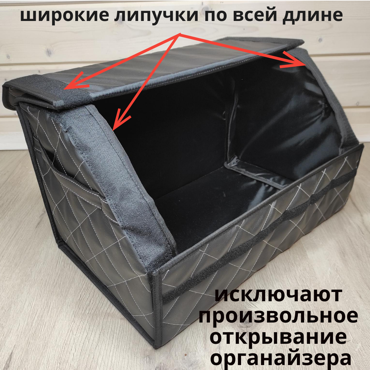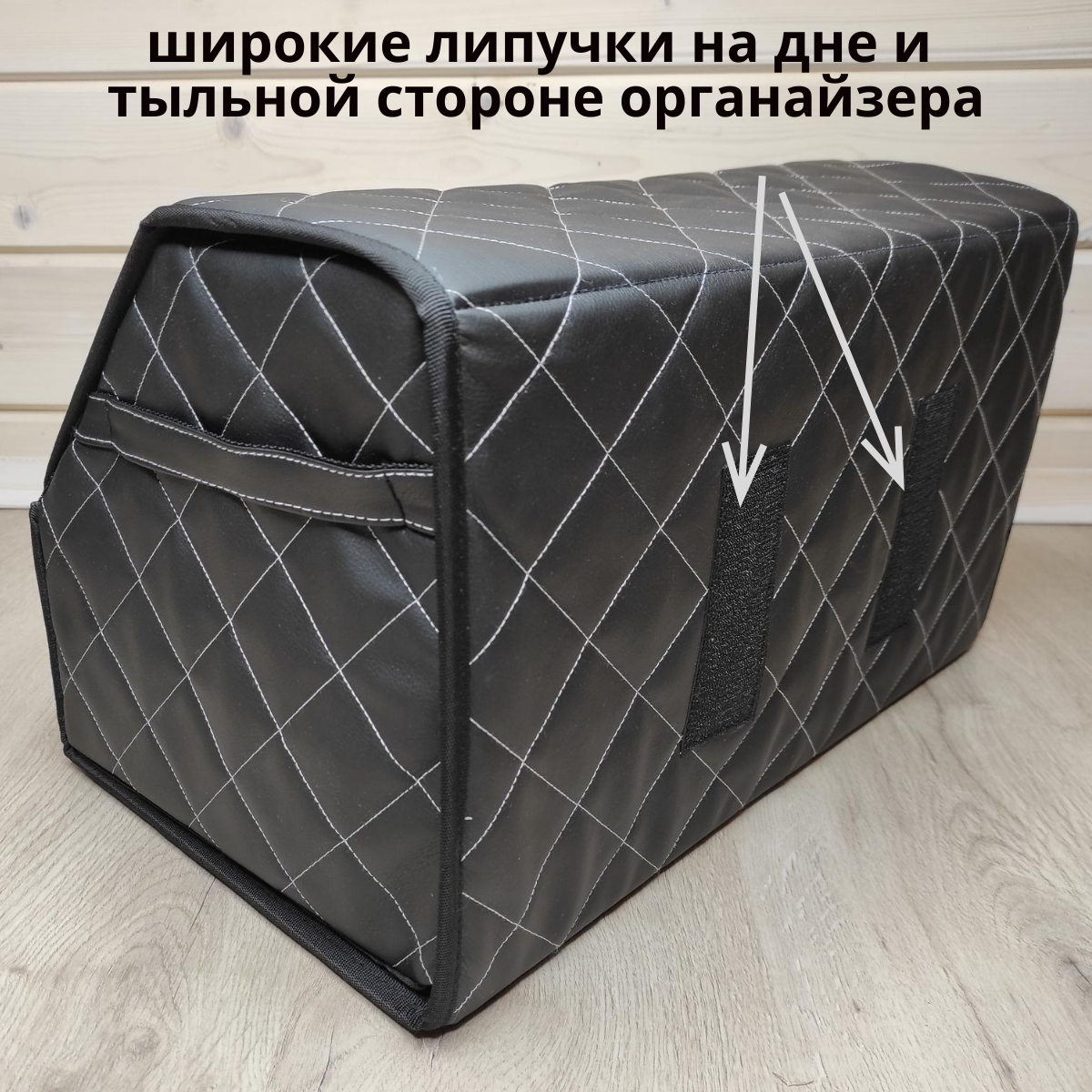 Комплектация:органайзер складнойОписание:Органайзер в багажник из экокожи-это стильный аксессуар, который позволит быстро и просто организовать пространство в багажнике автомобиля. Главная особенность-увеличенный размер липучек по всей длине органайзера!
