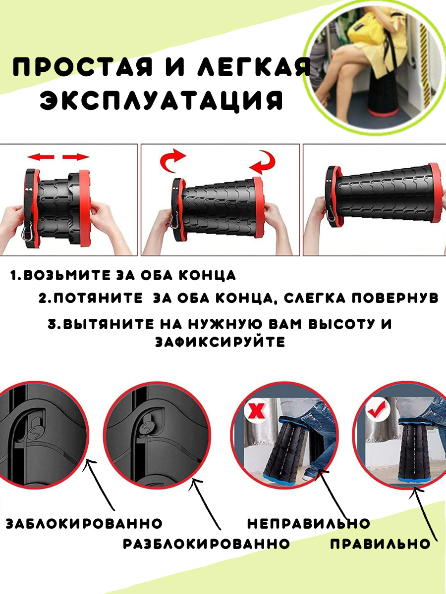 Телескопический складной стул-табурет подходит для использования дома, на природе, в транспорте. Компактный размер, лёгкость в использовании и вес 800г, позволят брать туристический табурет с собой в самых разнообразных случаях. Раскладной туристический с