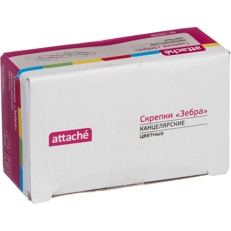 Скрепки Attache Зебра незаменимы при работе в офисе или дома, когда нужно соединить несколько бумаг, например, все листы договора или другие важные документы. Скрепки изготовлены из металла с цветным покрытием из пластикового полимера.Имеют удобную закруг