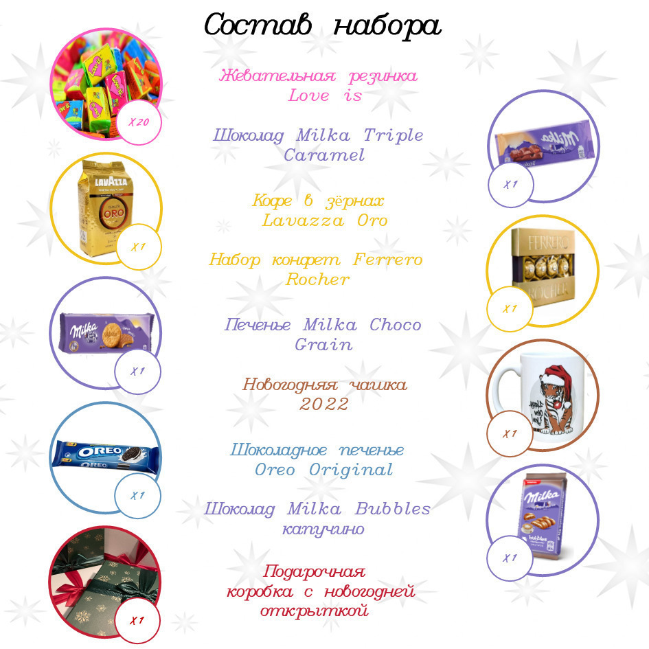 Условия хранения:В холодильникеСостав:Универсальный новогодний подарок для родных, друзей и коллег с новыми вкусами шоколада Milka, ароматным кофе Lavazza, и набором конфет Ferrero.Состав набора: - Жевательная резинка love is 20 шт- Кофе Lavazza 1 шт- Наб