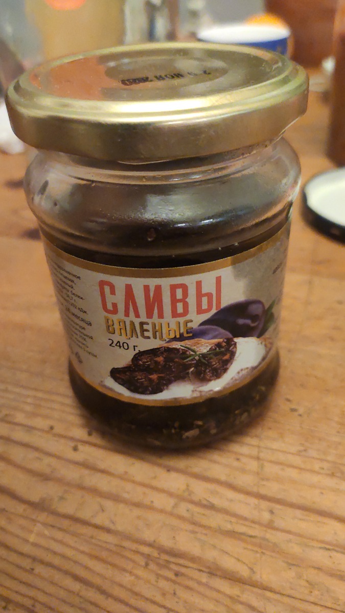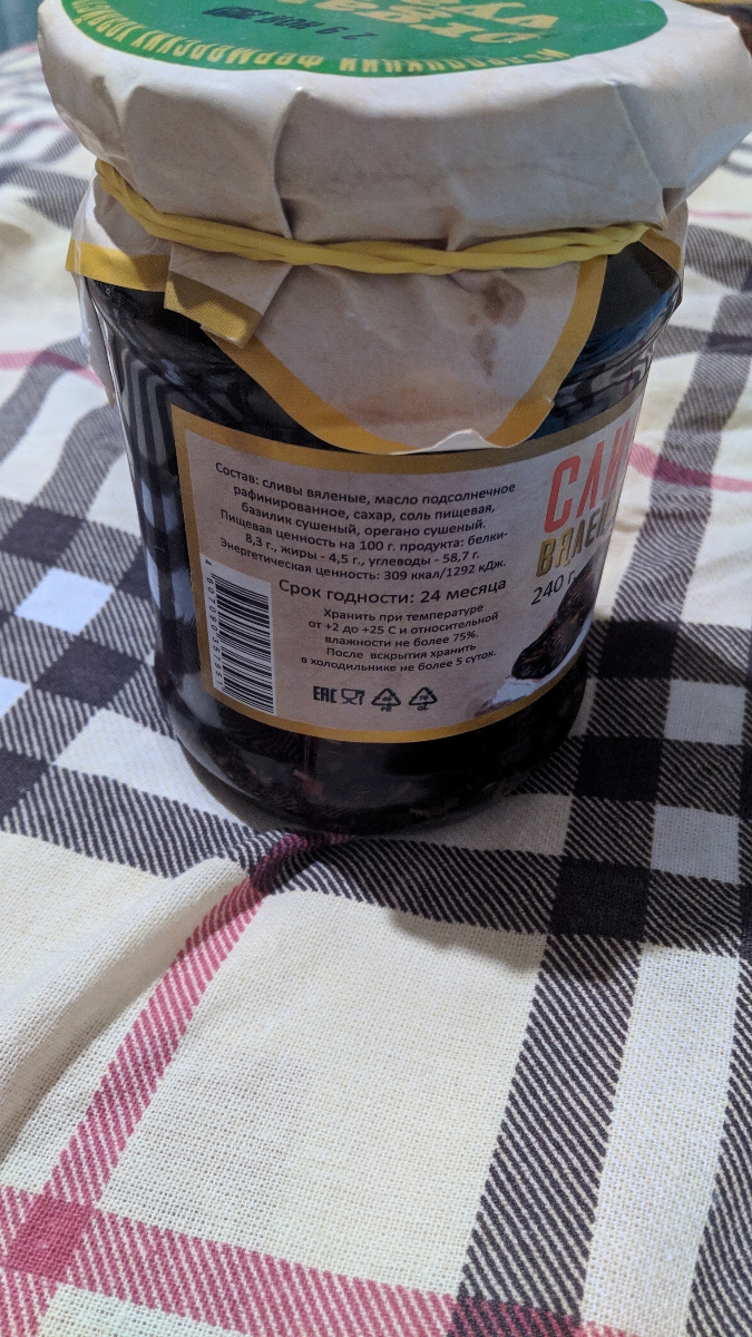 Состав:сливы вяленые, масло подсолнечное рафинированное, сахар, соль пищевая, базилик сушеный, орегано сушеный.Условия хранения:Хранить при температуре от +2 до +25С и относительной влажности не более 75%. После вскрытия хранить в холодильнике не более 5