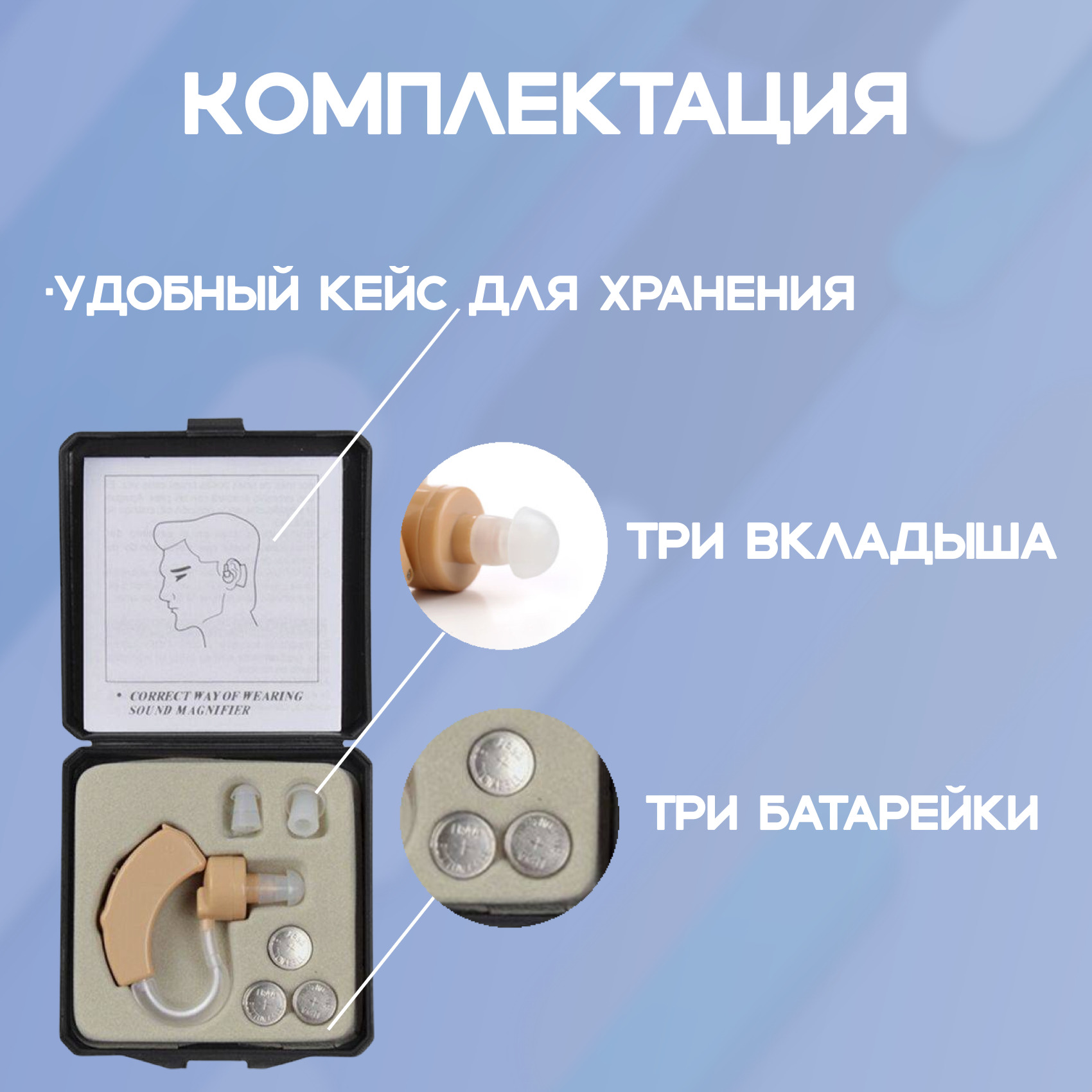 Комплектация:Слуховой аппарат, три силиконовых ушных вкладыша разных размеров, 3 батареи питания, коробка для хранения аппарата и принадлежностей, щеточка для удаления загрязнений с поверхности прибора, инструкция по эксплуатации. "Слуховой аппарат / Слух