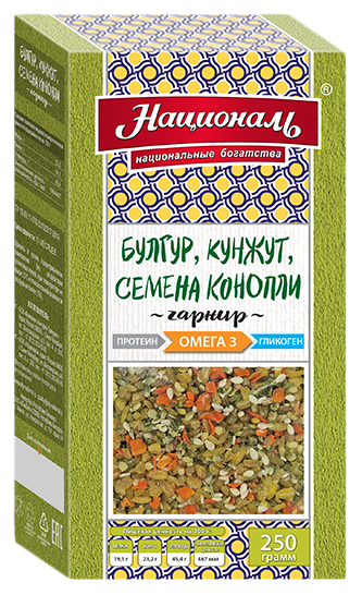 Состав:Состав: булгур пшеничный, семена конопли очищенные, кунжут светлый, морковь сушёная, лук порей сушёный.Условия хранения:Хранить от 0 до 25 С и относительной влажности воздуха не более 75%.Описание:Уникальный состав гарнира богат содержанием Омега-