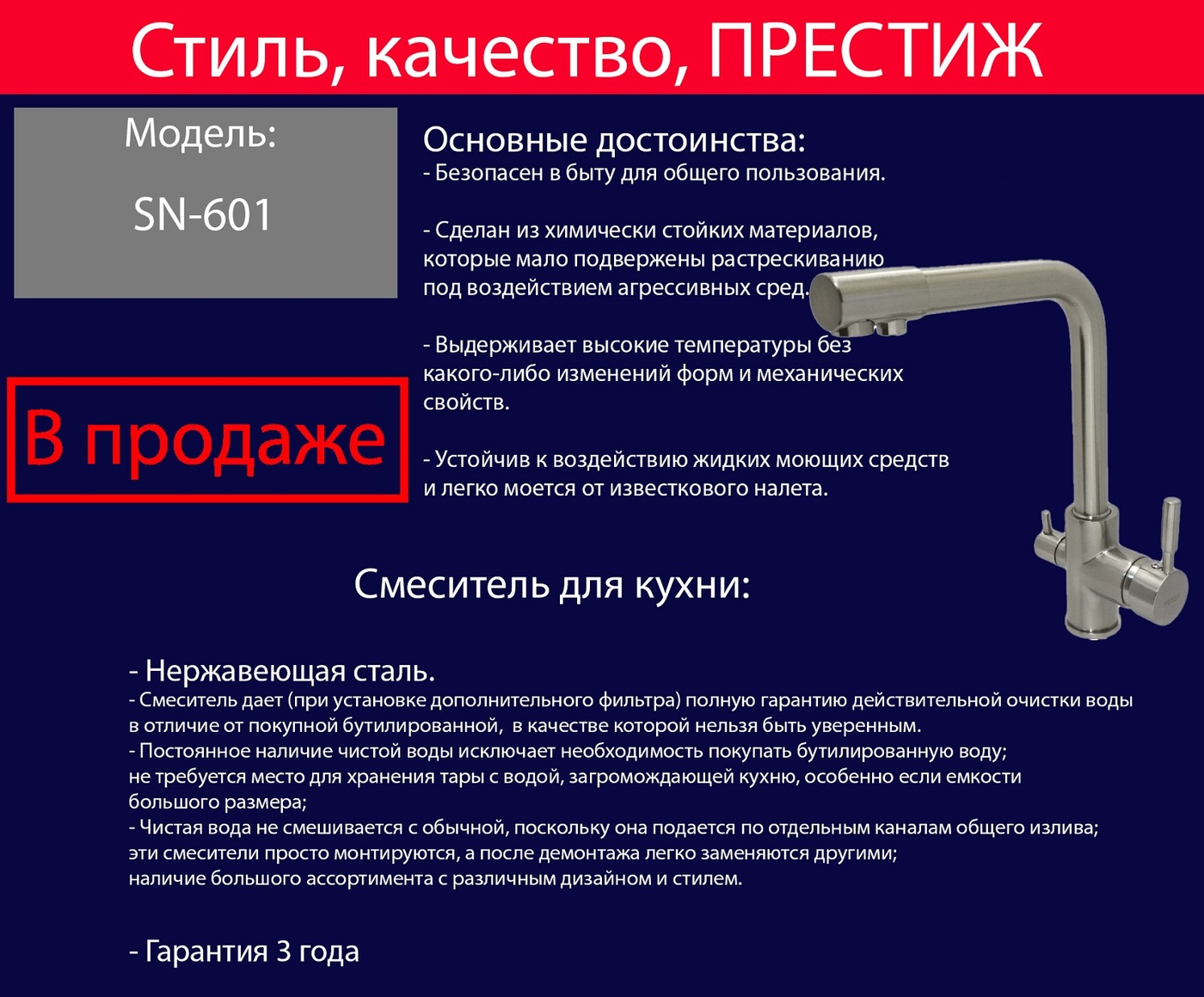 Комплектация:Смеситель, уплотнительное кольцо, трубка с резьбой, резиновая прокладка, крепежная гайка, гибкая подводка. *Состав комплекта зависит от модели смесителя.Описание:Смеситель SN-601 имеет уникальную особенность - сразу встроенный выход для очище