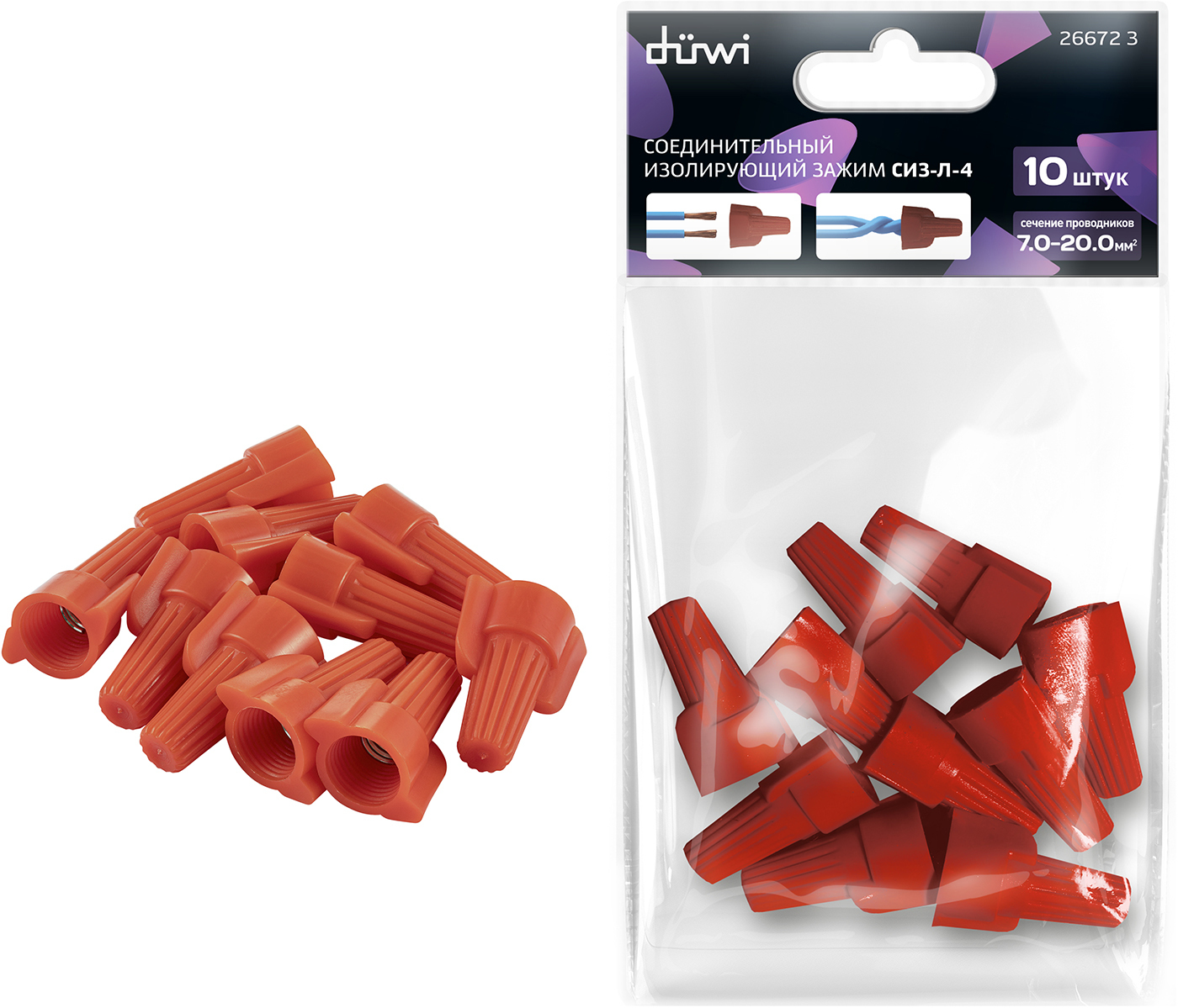 Соединительный изолирующий зажим для проводов с сечением 7,0 - 20,0 мм2 накручивают на оголенные части проводов, при этом внешний корпус выполняет функцию изоляции. Их используют при электромонтажных работах как в бытовых, так и в промышленных помещениях.
