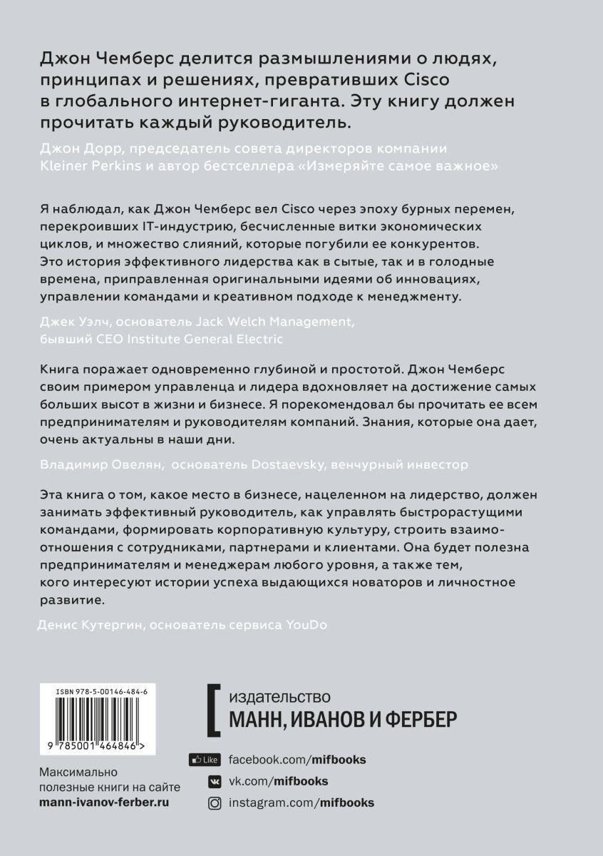 Джон Чемберс, бывший СЕО Cisco, не только рассказывает о своих карьерных уроках, но и показывает, как они взаимосвязаны с базовыми человеческими принципами и как сложно было их отстаивать в переломные моменты.