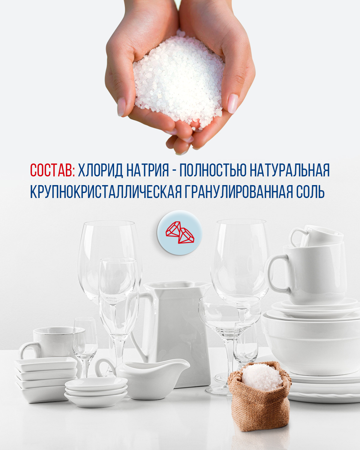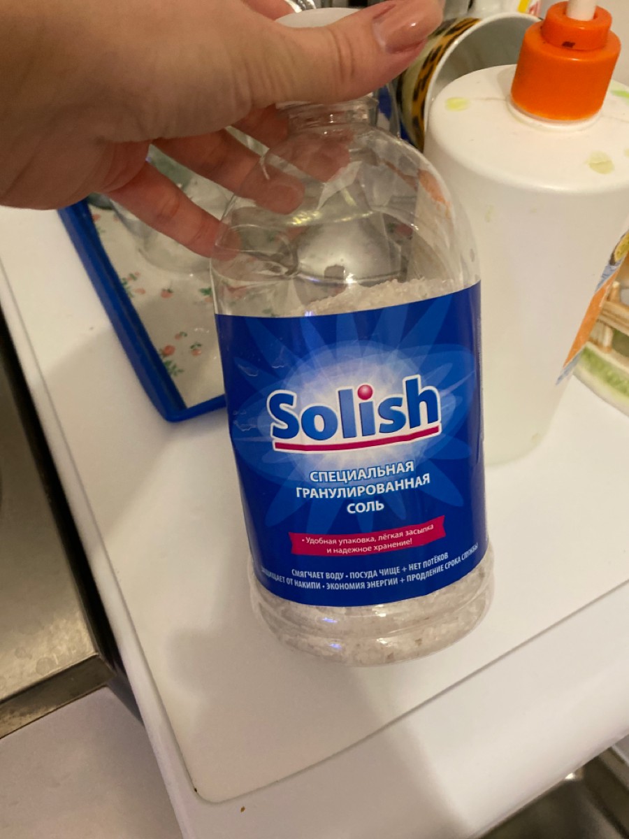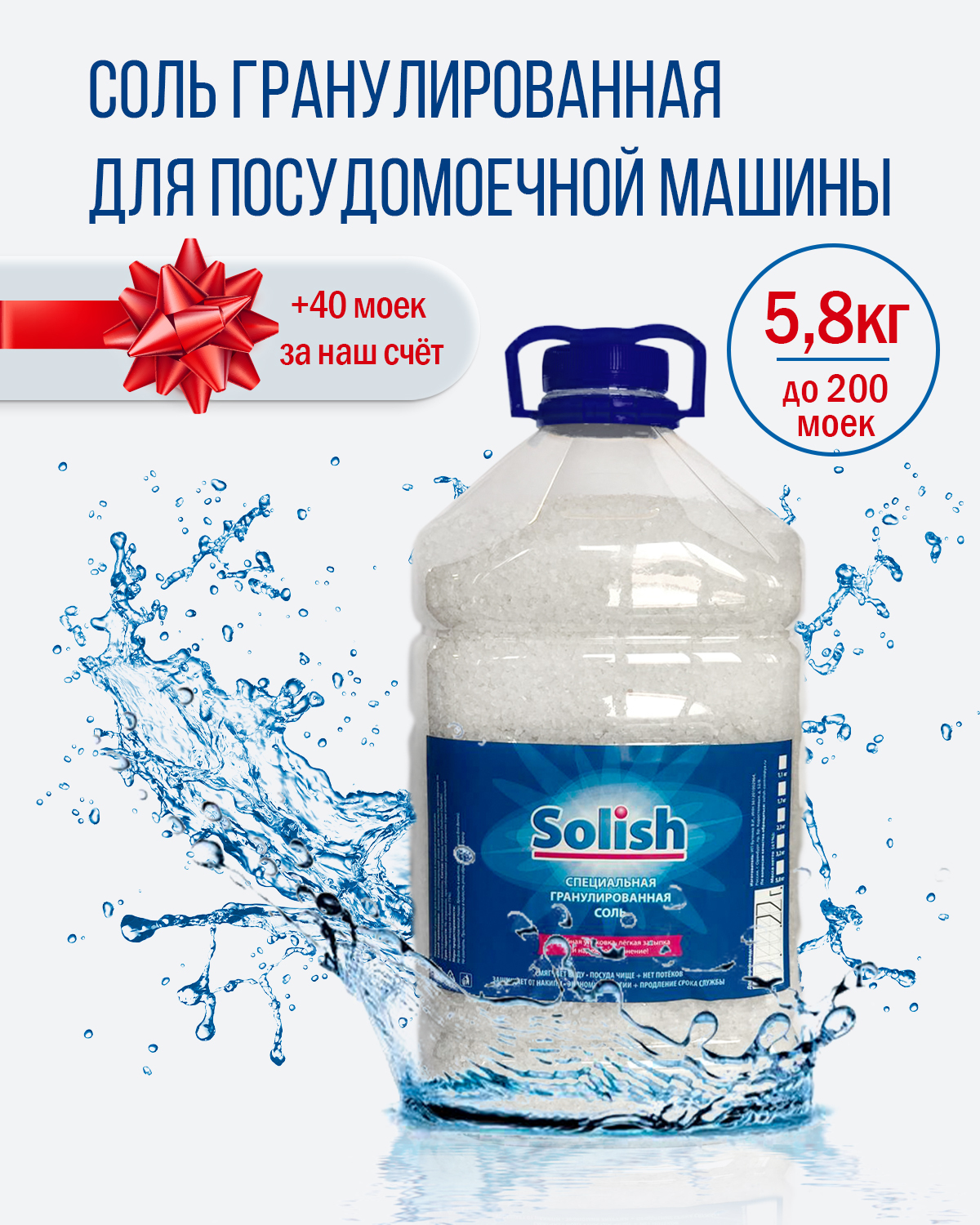 ЧЕМ ПОМОГАЕТ СОЛЬ? Специальная соль для посудомоечных машин Solish предупреждает образование накипи, что продлевает срок службы и экономит энергию на нагрев воды. Соль Solish также обеспечивает эффективную работу систем смягчения воды, придает блеск посуд