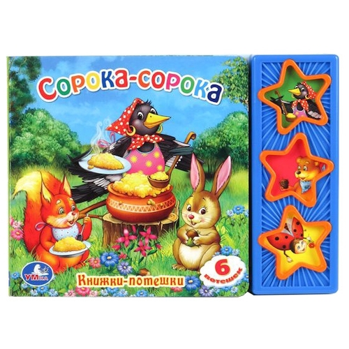 Аннотация: Детскую книжку «Сорока-Белобока» читать вместе с мамой будет очень весело и интересно. В ней множество красивых ярких иллюстраций, забавные несложные стихи и глазки, которые «оживляют» персонажей книги на всех ее разворотах. Картонные страницы