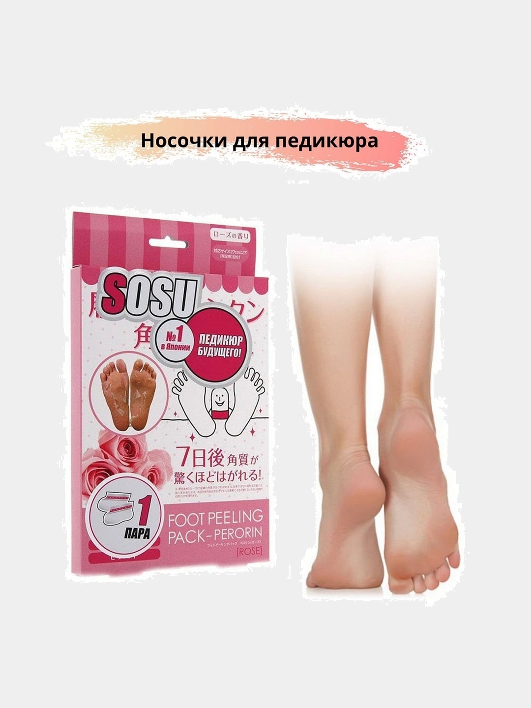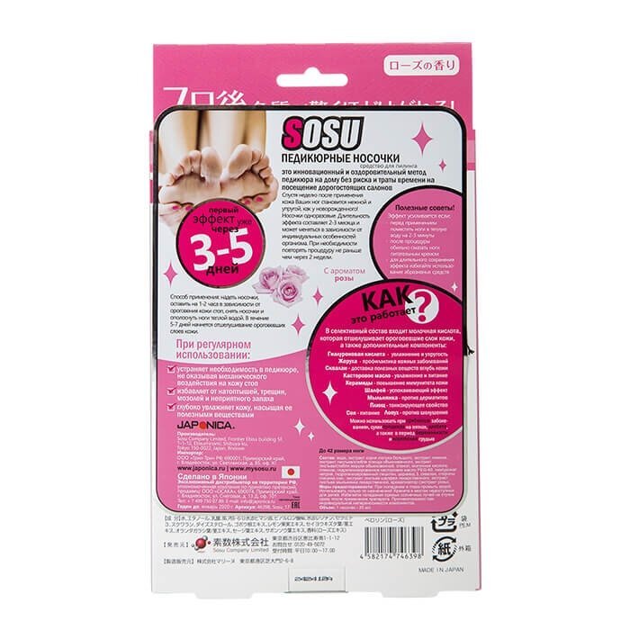 Способ применения:Отрежьте верхнюю часть пакета, достаньте носочки. Будьте осторожны - не разлейте жидкость, которая находится внутри носочков. Наденьте носочки и оставьте на 1-2 часа в зависимости от состояния кожи стоп. Снимите носочки и помойте ноги в