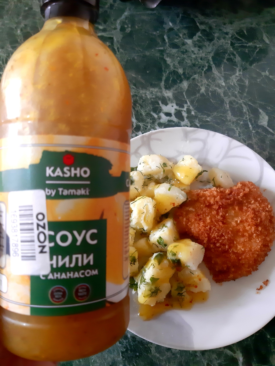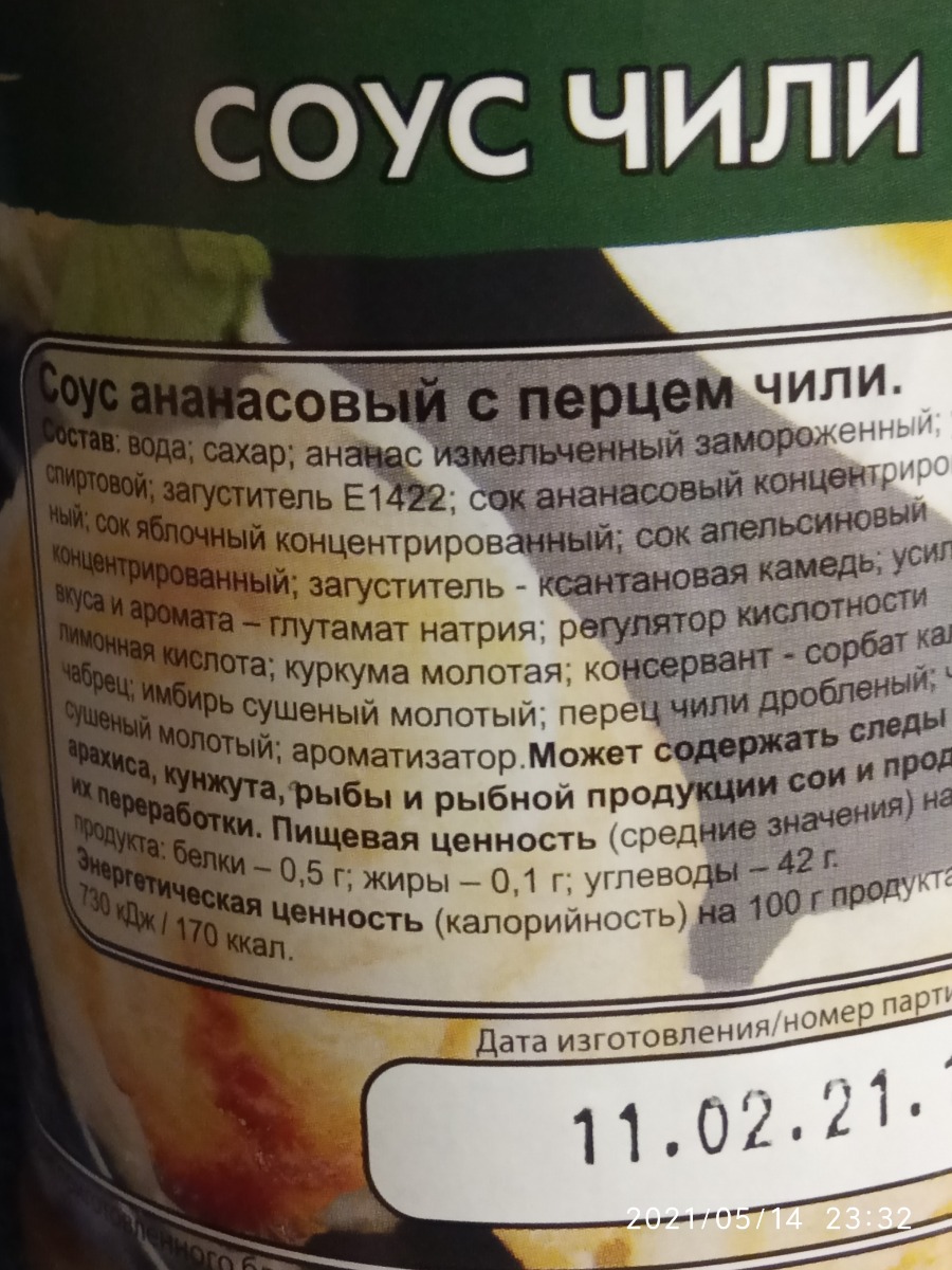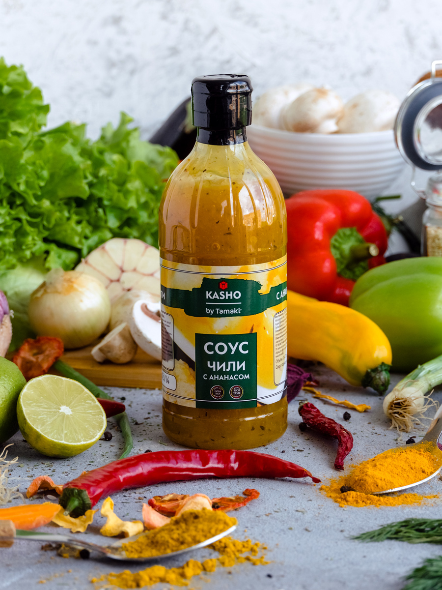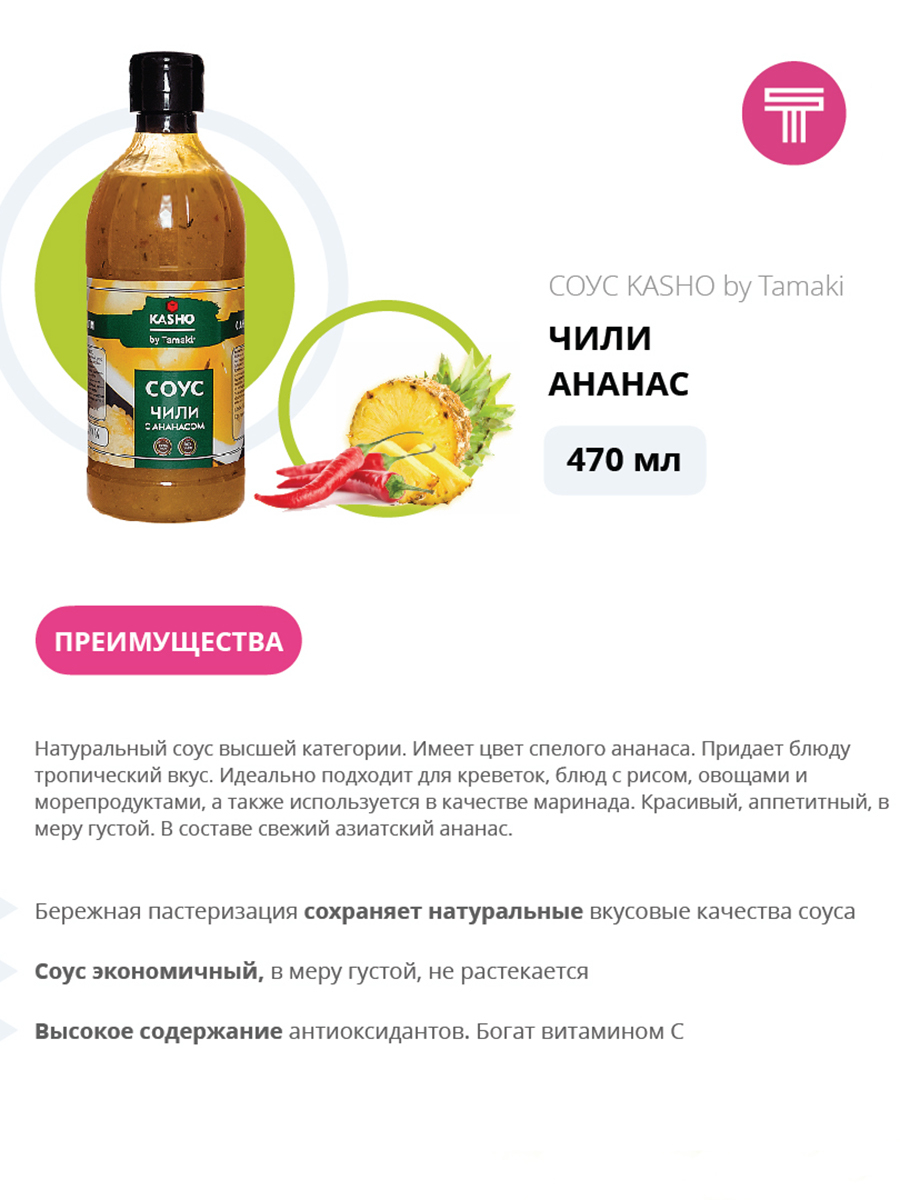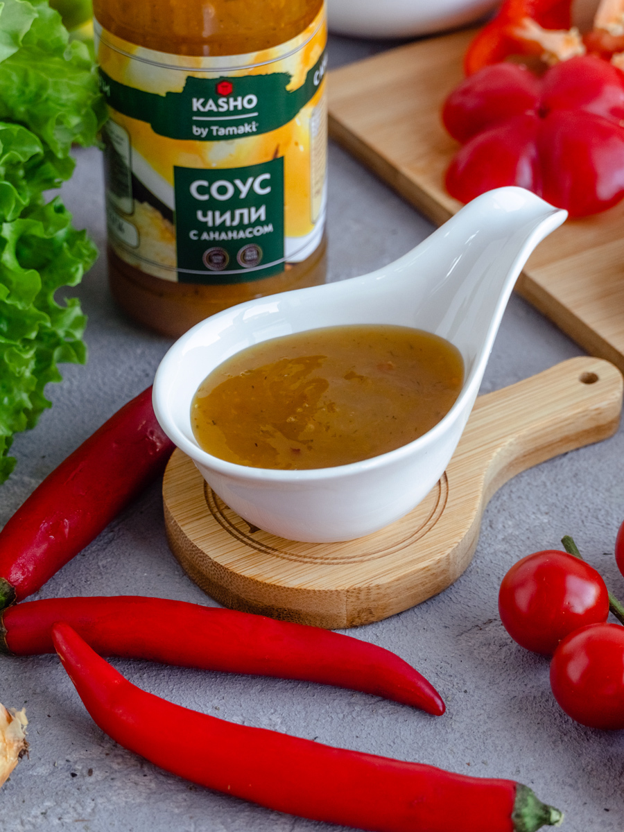 Натуральный соус высшей категории. Имеет цвет спелого ананаса. Придает блюду тропический вкус. Идеально подходит для креветок, блюд с рисом, овощами и морепродуктами, а также используется в качестве маринада. Красивый аппетитный, в меру густой. В составе