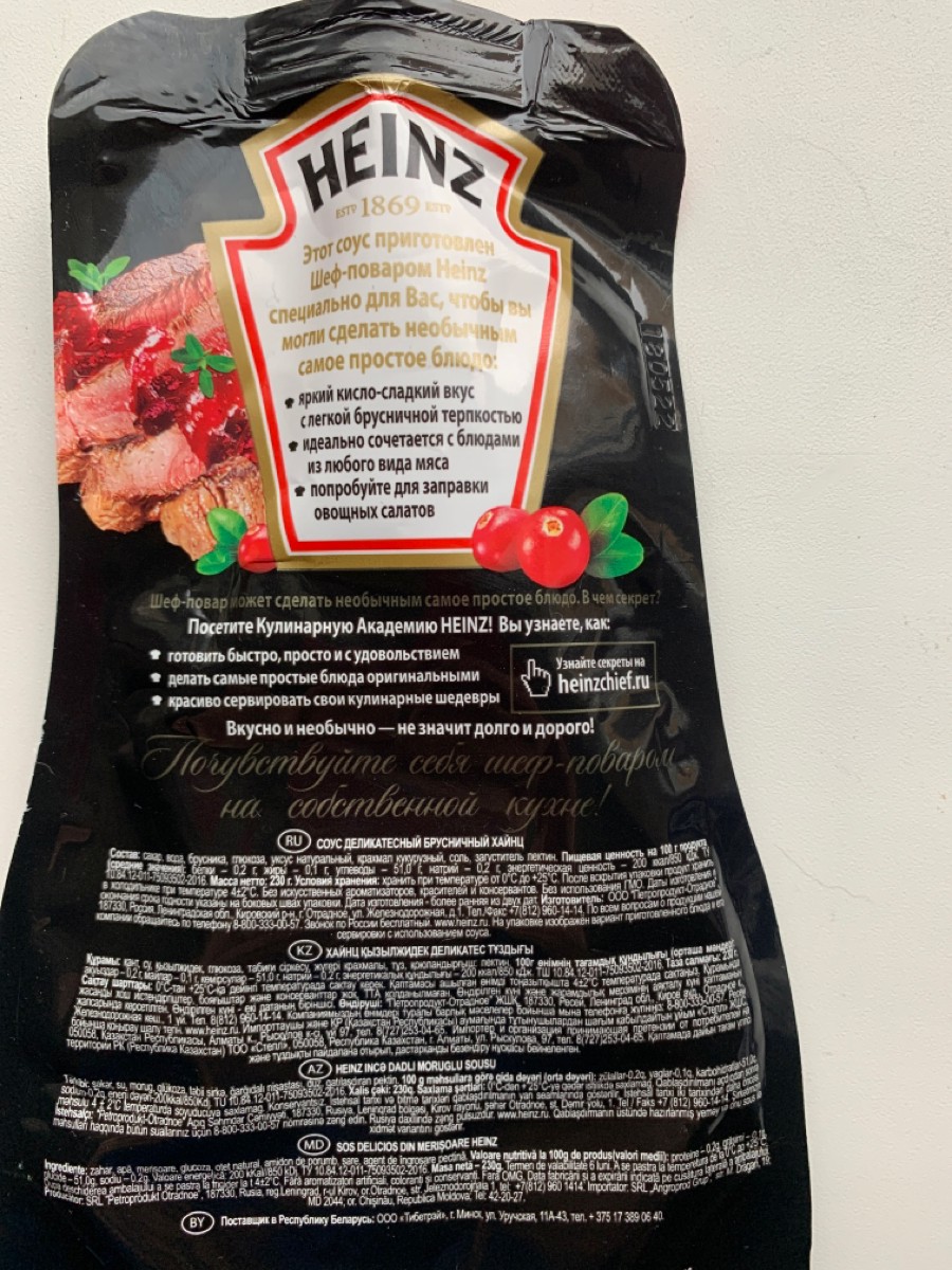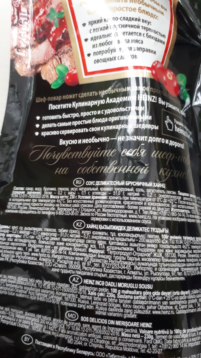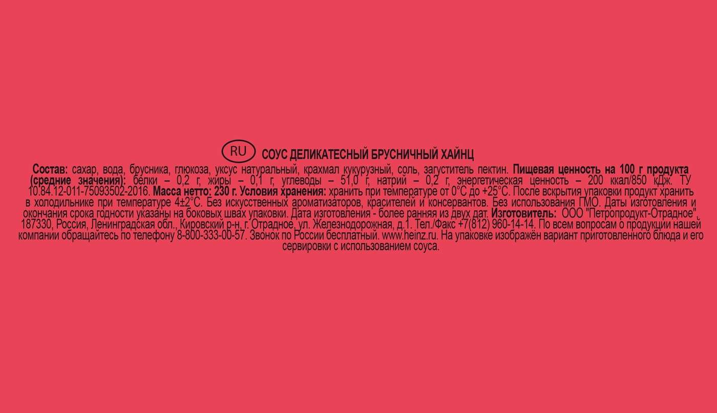 Соус Heinz Брусничный Деликатесный, 230 гУсловия хранения:При температуре от +5`С до +25`С, с относительной влажностью воздуха не более 85%, после вскрытия хранить в холодильникеСостав:сахар, вода, брусника, глюкоза, уксус натуральный, крахмал кукурузный,