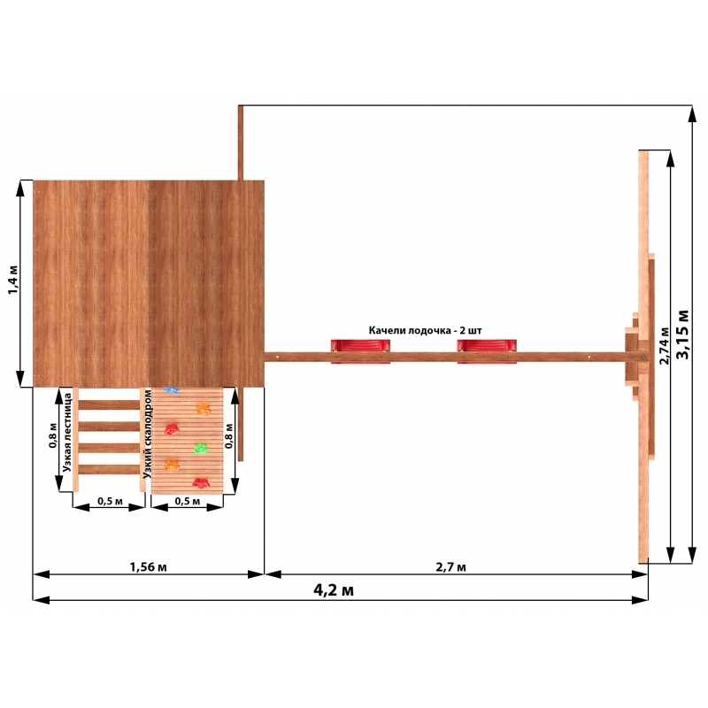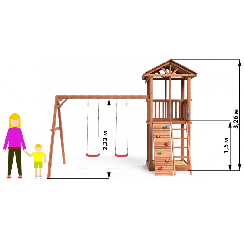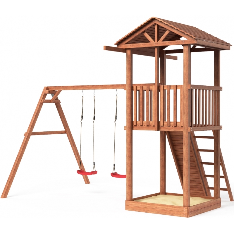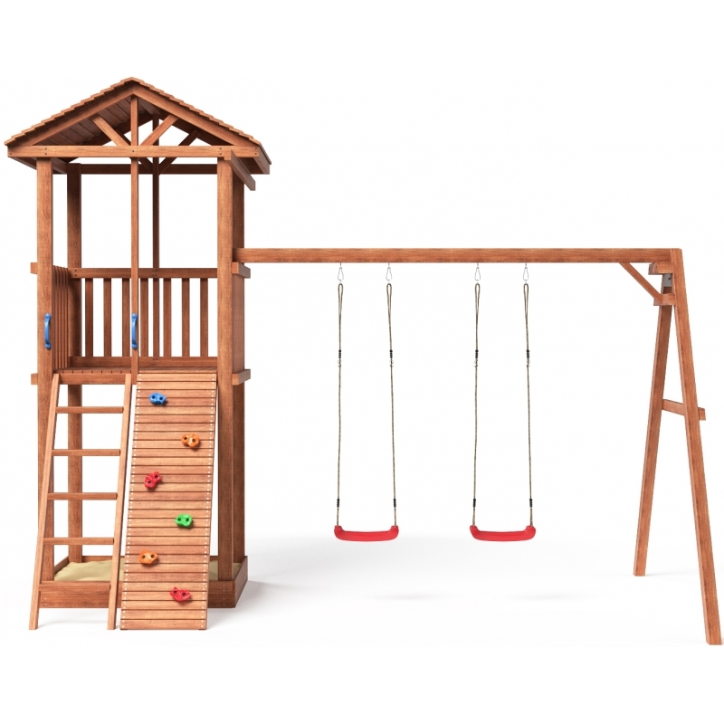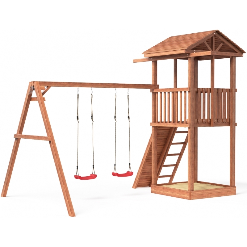 Характеристики:Предназначена для детей от 4 до 15 лет.Силовые детали выполнены из лесоматериалов лиственных и хвойных пород.Размещается площадка на грунте (бетонирование не обязательно).Пространство под башней используется как песочница (120 см на 120 см