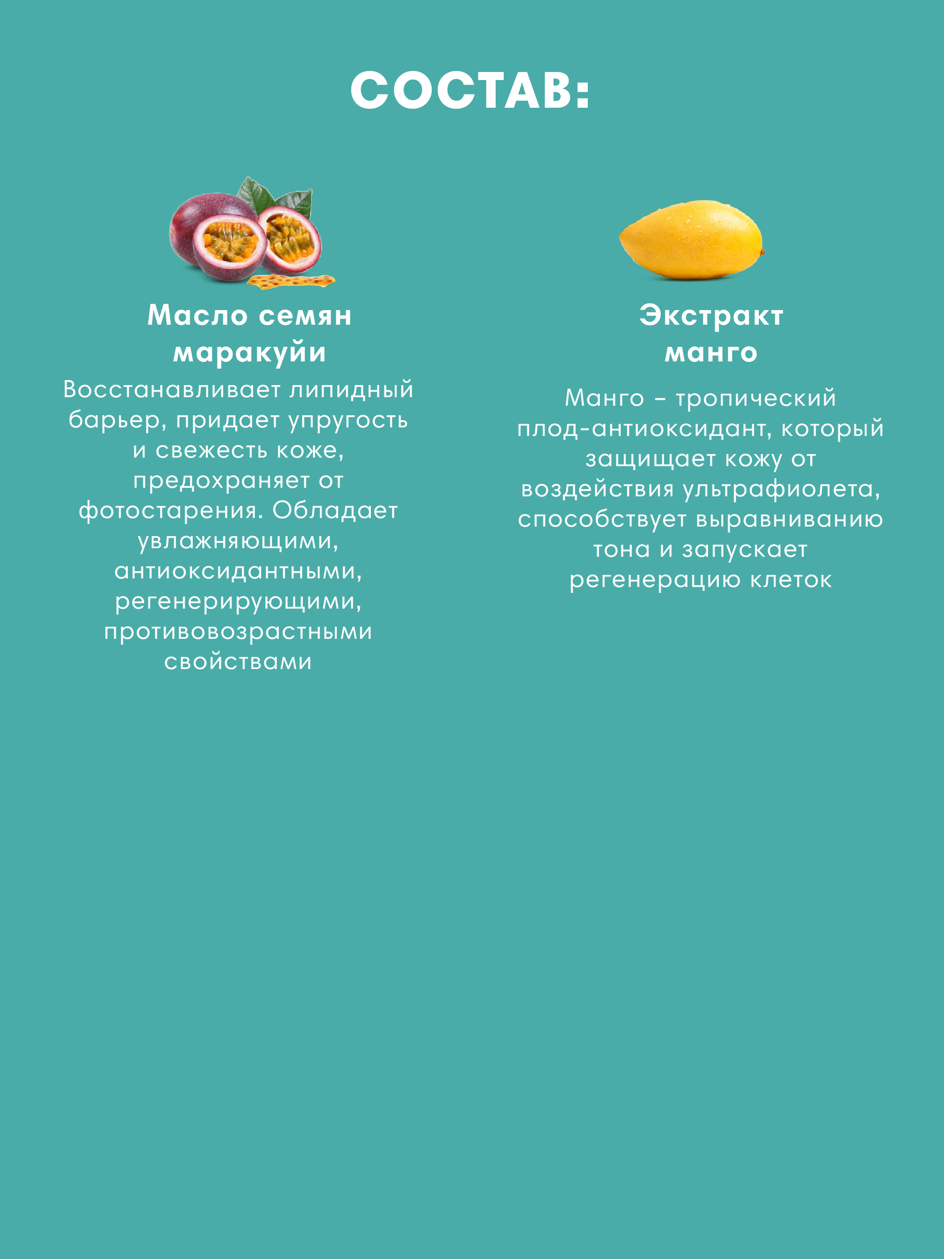 Когда нет времени на многочисленные уходовые процедуры, но кожа нуждается в срочном и эффективном увлажнении, вам поможет невероятный мист манго-маракуйя. Легкий и освежающий спрей-мист, обладающий ярким тропическим ароматом, дарит коже сияние и ощущение