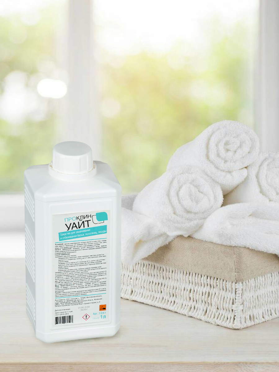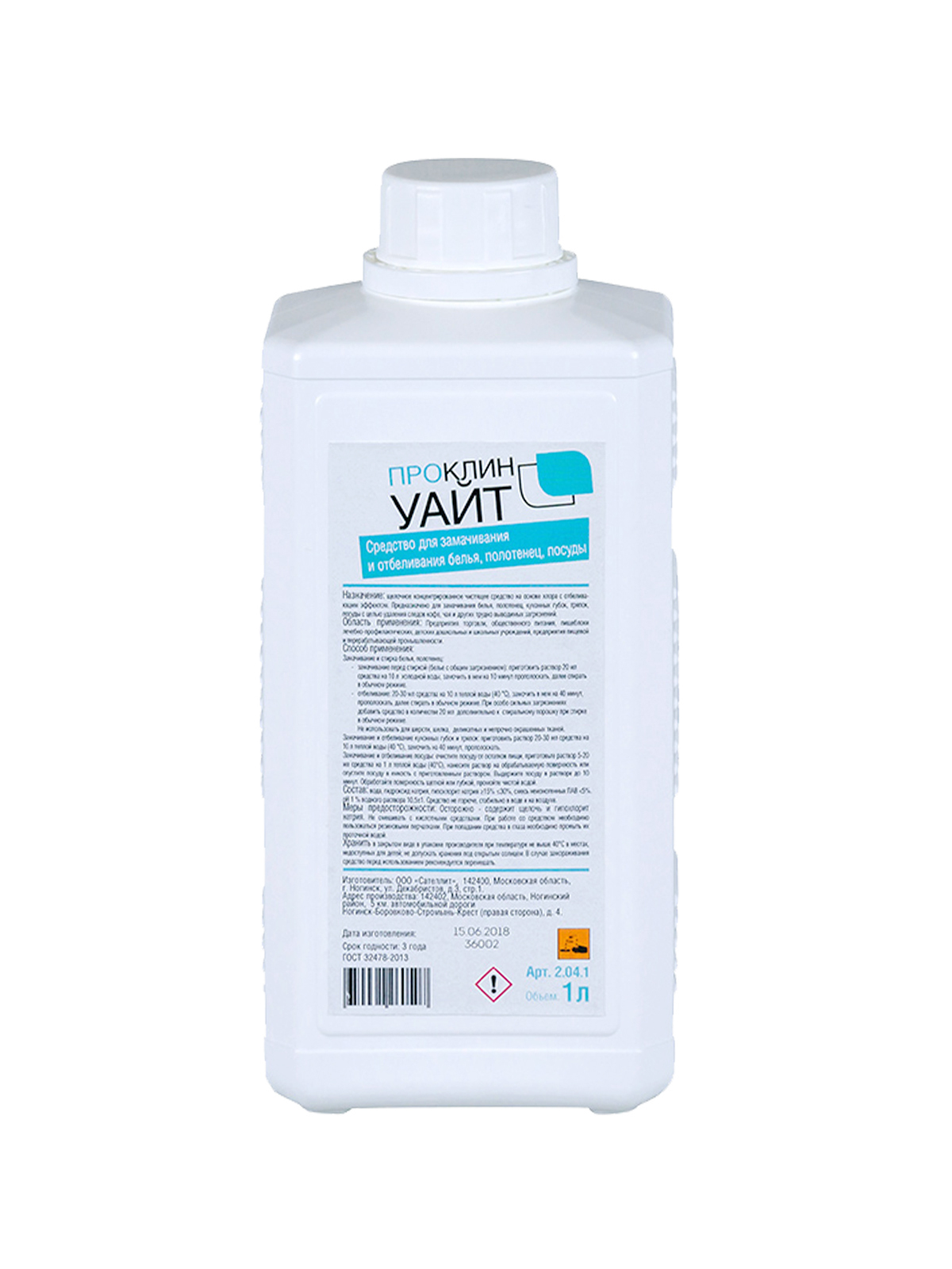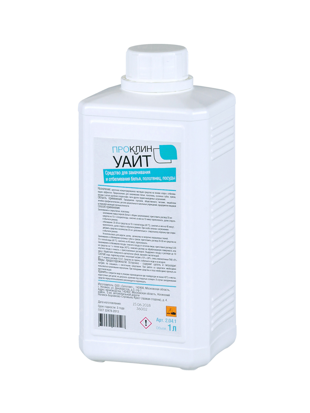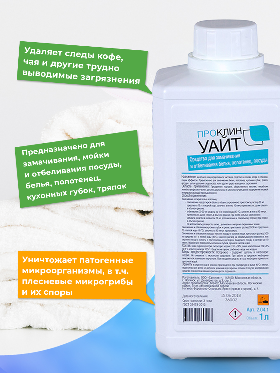 Состав:вода, хлорное соединение, смесь неионогенных ПАВ, щёлочь, фосфонатыОписание:Средство для отбеливания посуды и различных поверхностей ПРОКЛИН УАЙТ применяется для замачивания и отбеливания как посуды и кухонной утвари, так и белья и полотенец, кухон