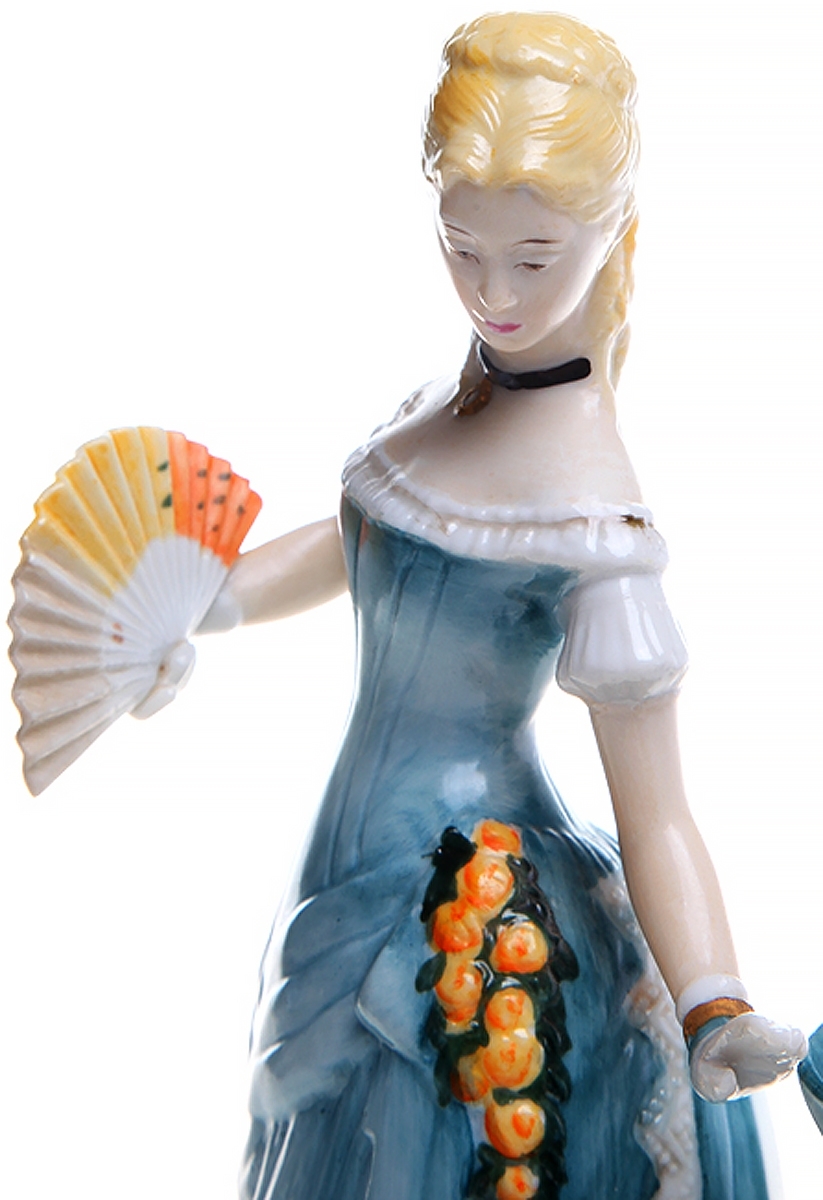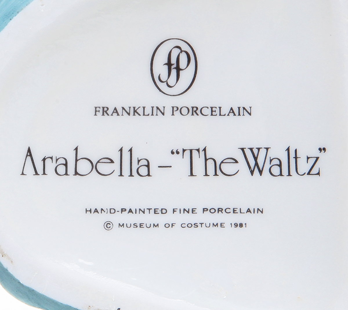 Статуэтка "Арабелла. Вальс". Серия "Красавицы на балу".Фарфор, роспись, ручная работа.Маркировка: надглазурное клеймо черного цвета "Franklin porcelain" и "Hand-painted. Fine porcelain. Museum of costume 1981".Датировка: США, 1981 год.Ограниченный тираж.