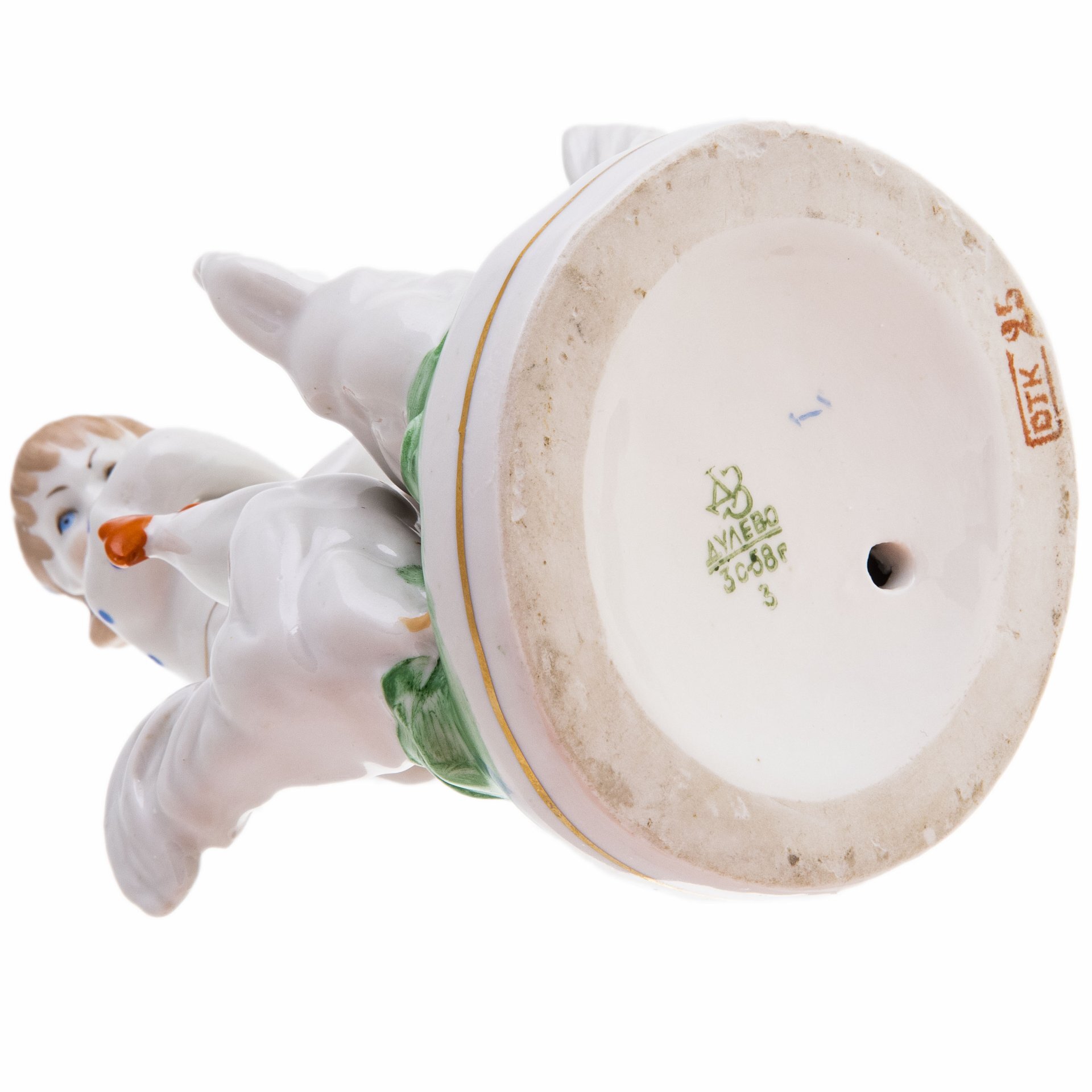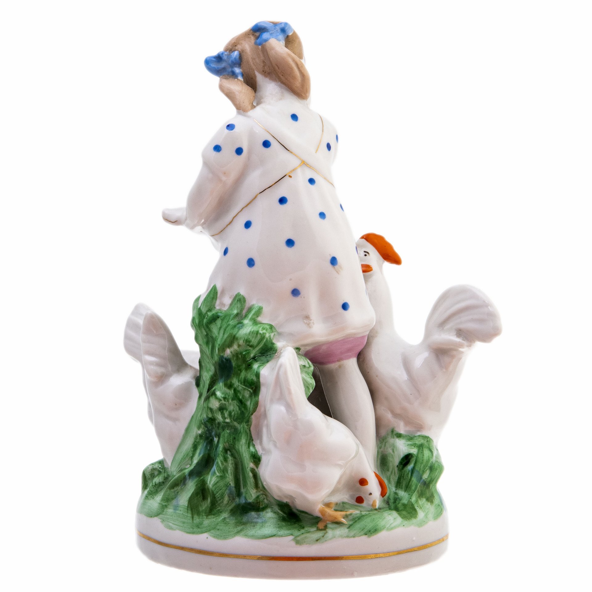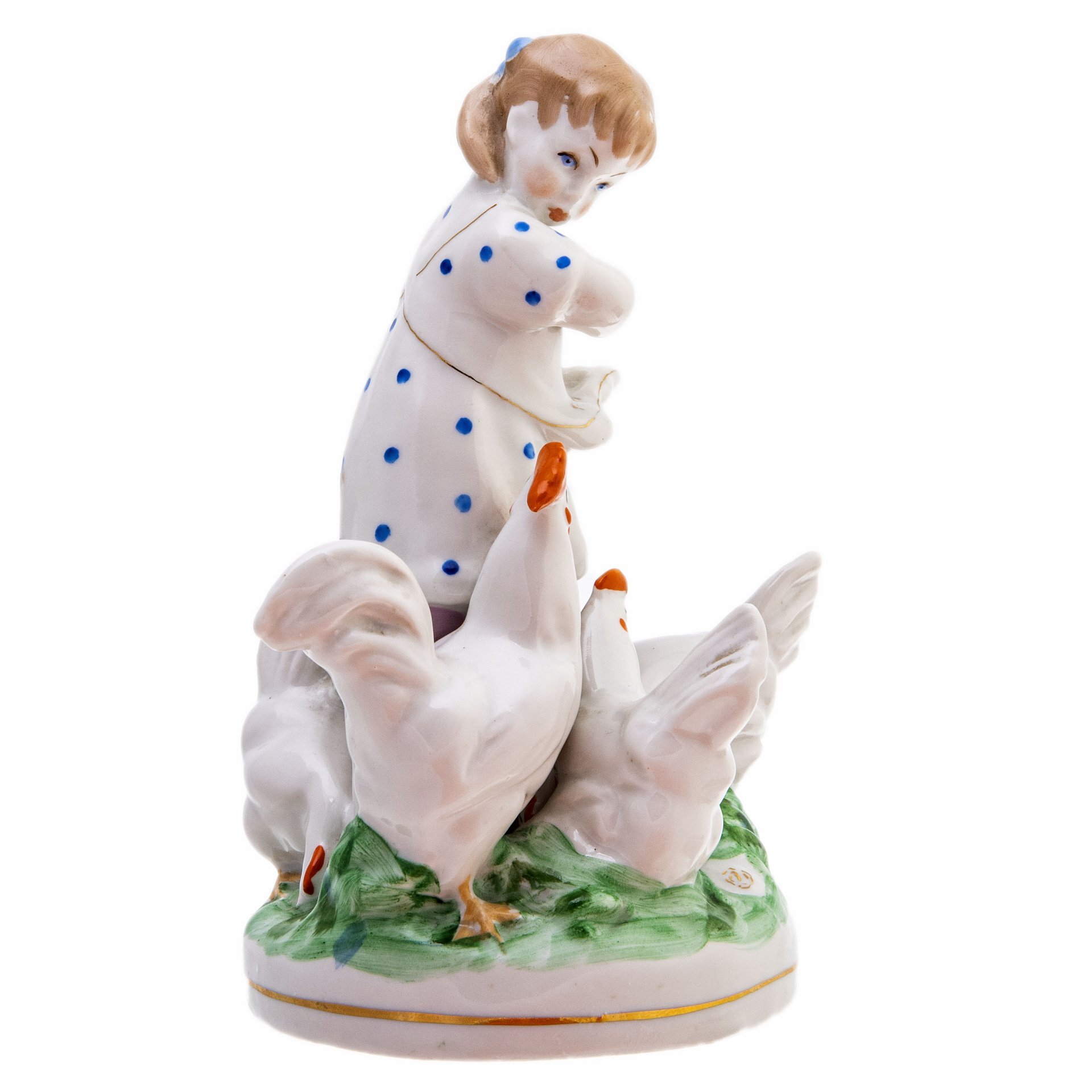 Статуэтка фарфоровая “Девочка кормит кур”. Статуэтка представляет собой маленькую светловолосую девочку с голубыми бантиками в волосах и платьице в синий горошек, левой рукой она придерживает фартук, в котором находится зерно, а правой рукой - разбрасыв