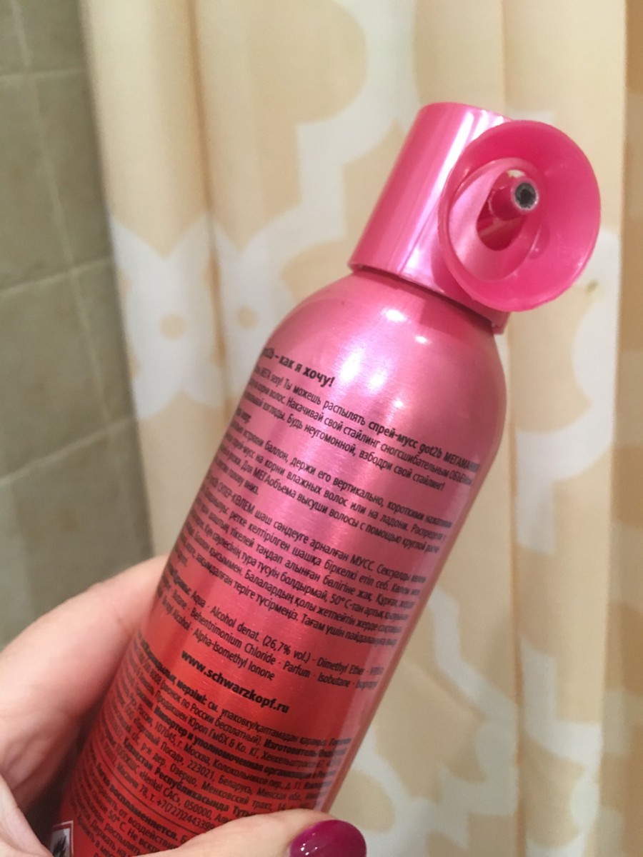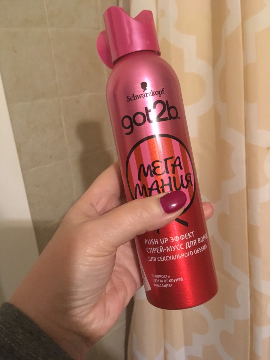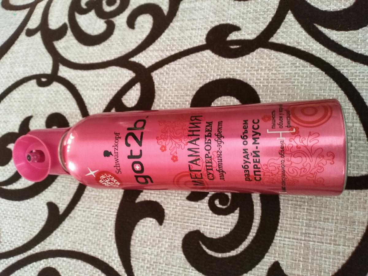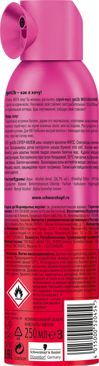 Состав:Состав (ingredients) указан на упаковкеОписание:Теперь ты можешь распылять спрей-мусс got2b МЕГАмания сразу на корни волос. Накачивай свой стайлинг сногсшибательным объемом и приковывай взгляды. Будь неугомонной, взбодри свой стайлинг!• Пышность.•