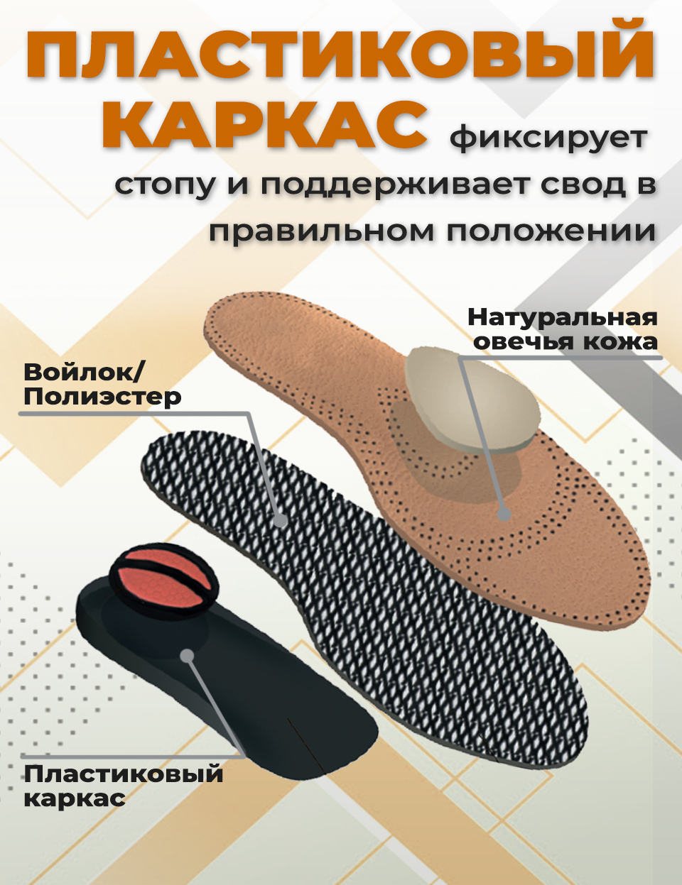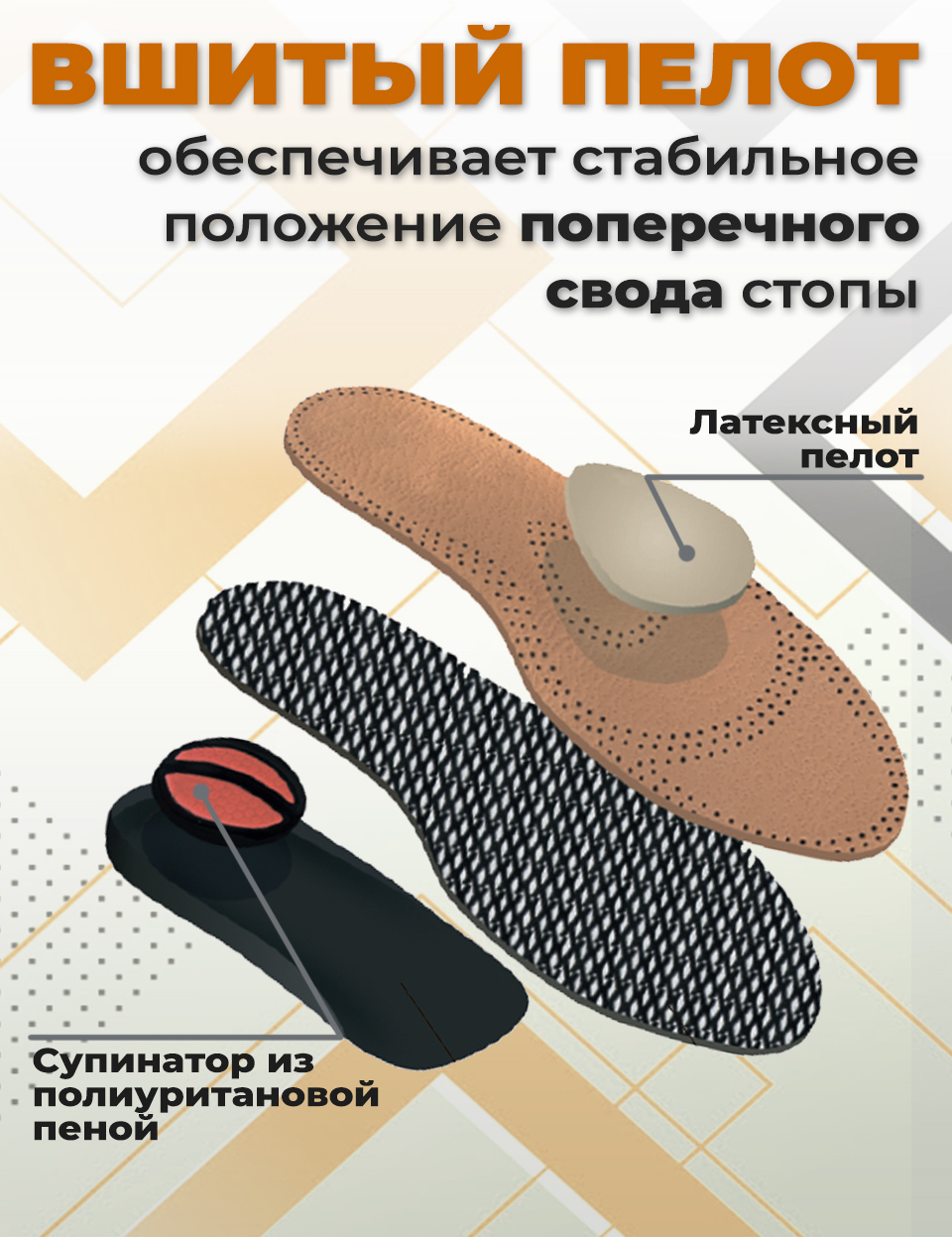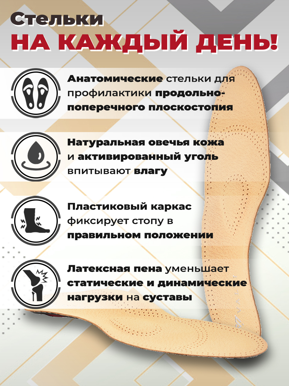 Двухслойные анатомические стельки для профилактики продольно-поперечного плоскостопия изготовлены из качественной натуральной овечьей кожи и мягкой латексной пены на профилированном каркасе. Натуральная кожа совместно с активированным углём прекрасно впит