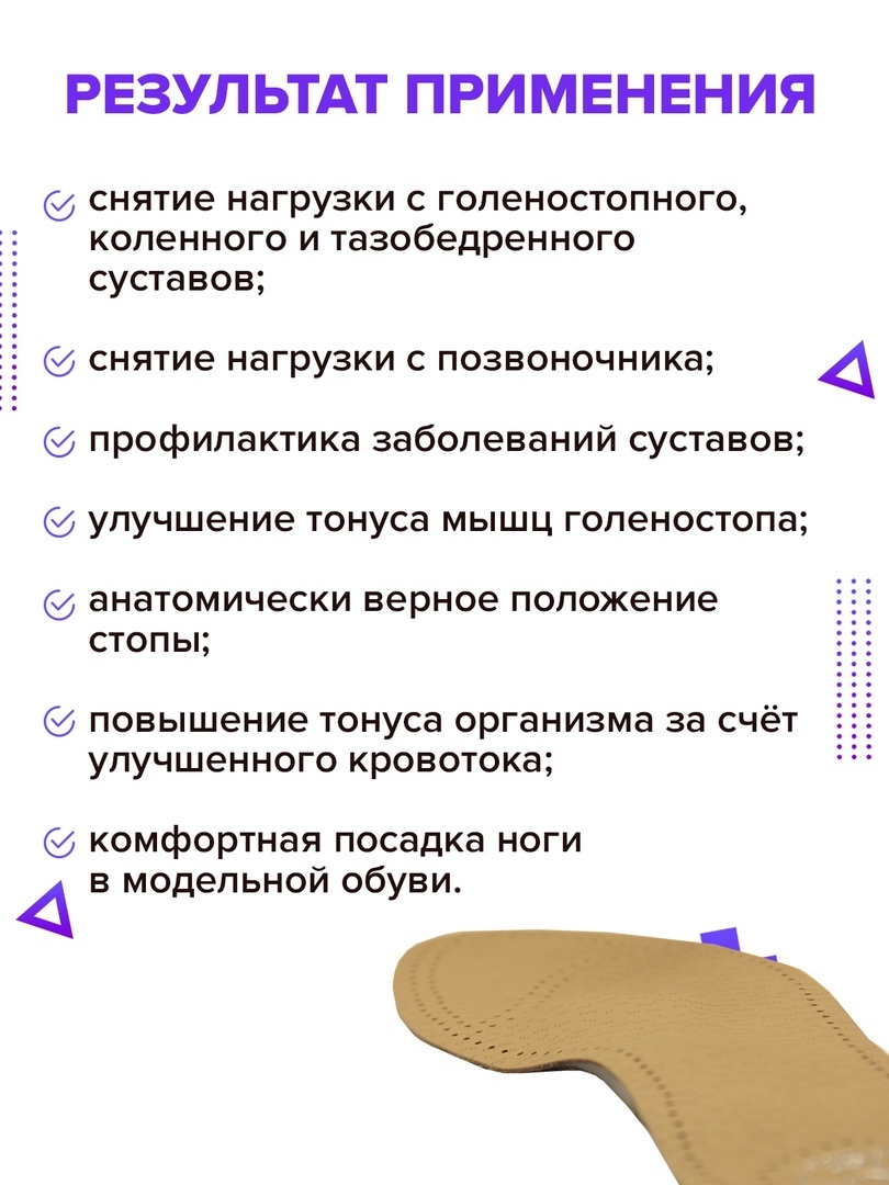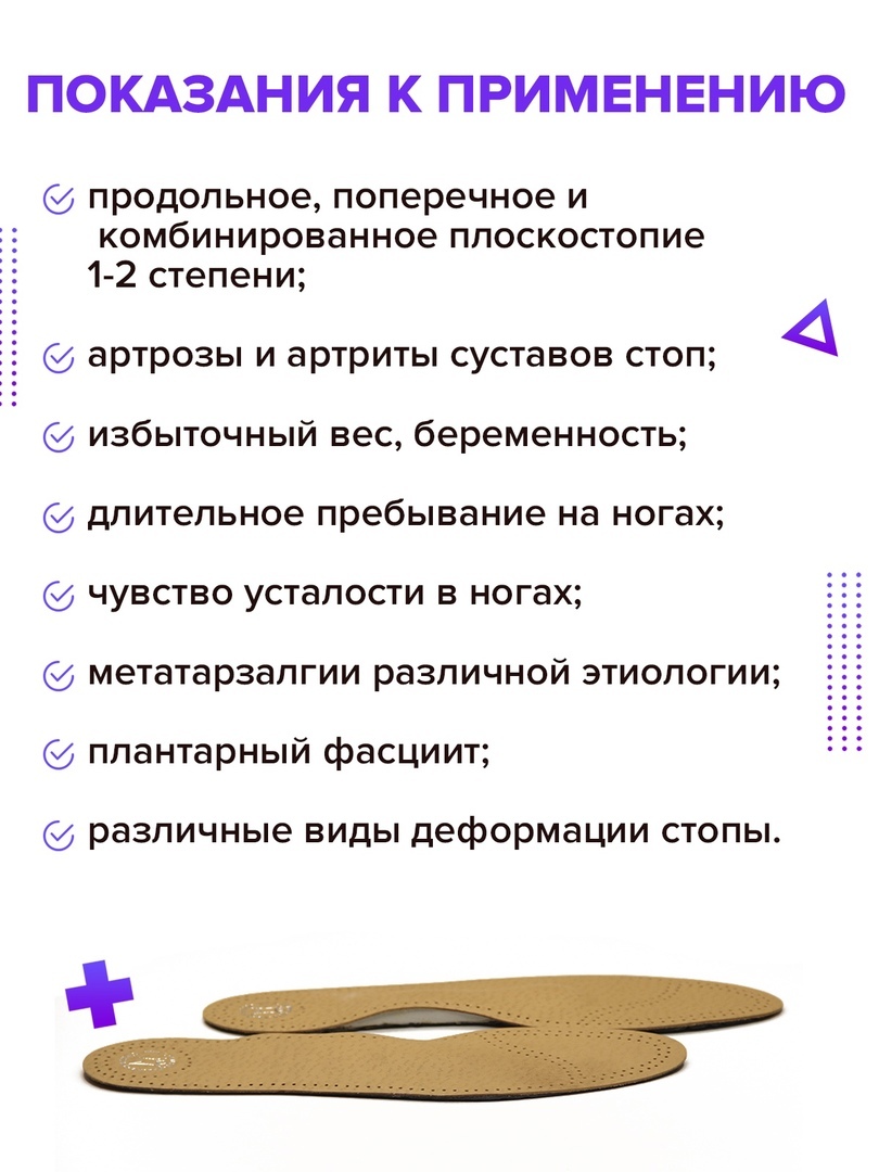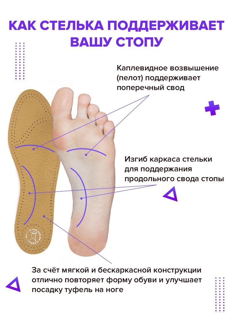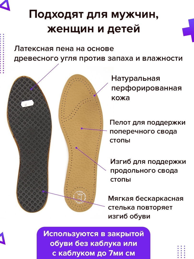 Предназначены для закрытой обуви, в том числе для обуви на каблуке до 7 смснабжены мягким пелотом для поддержки сводов стопыоснова — латексная пена с добавлением древесного угля, нейтрализующего запах и уменьшающего влажность в обуви. Обладает антибактери