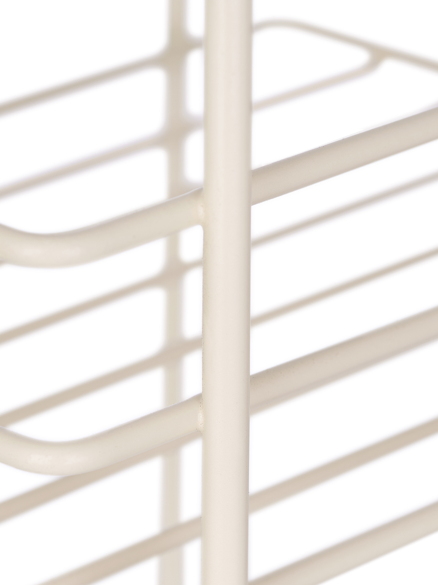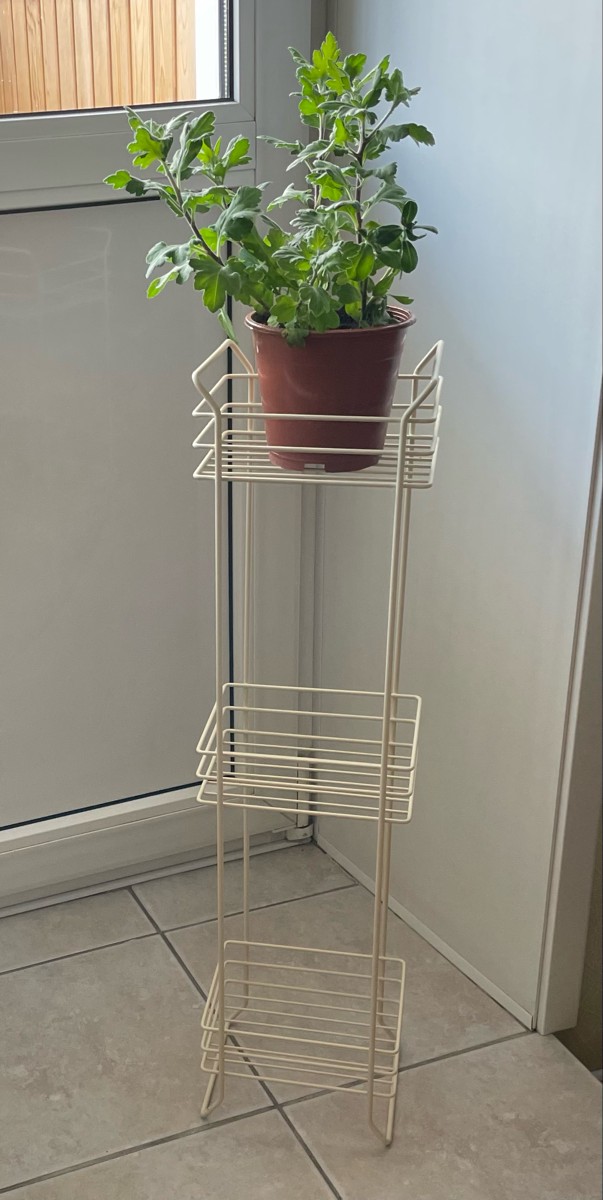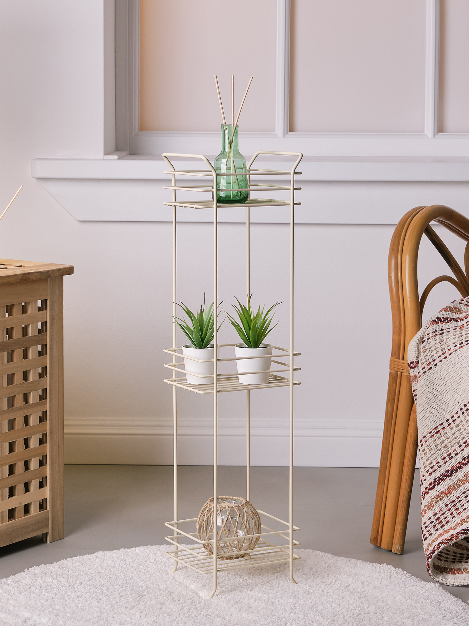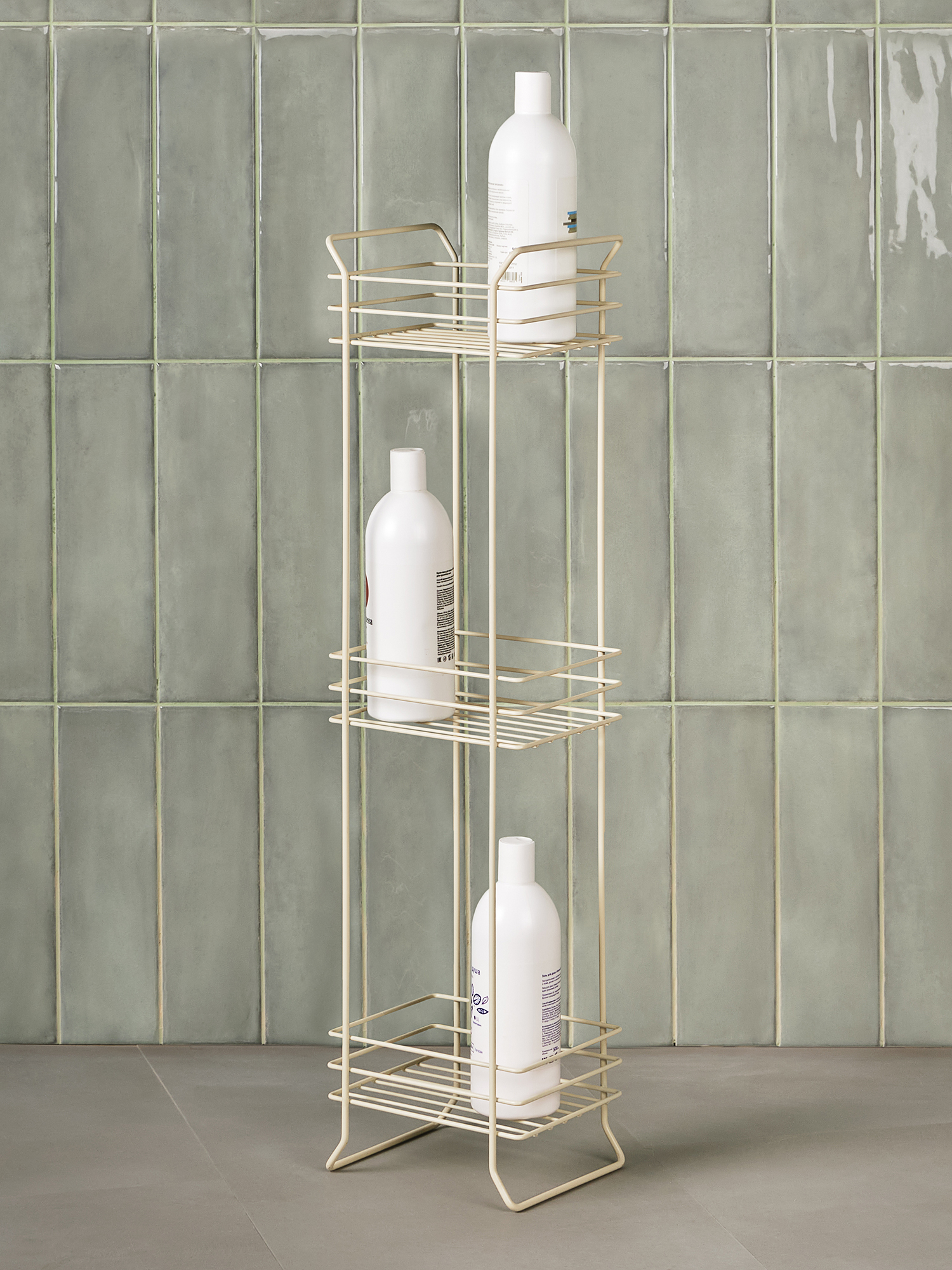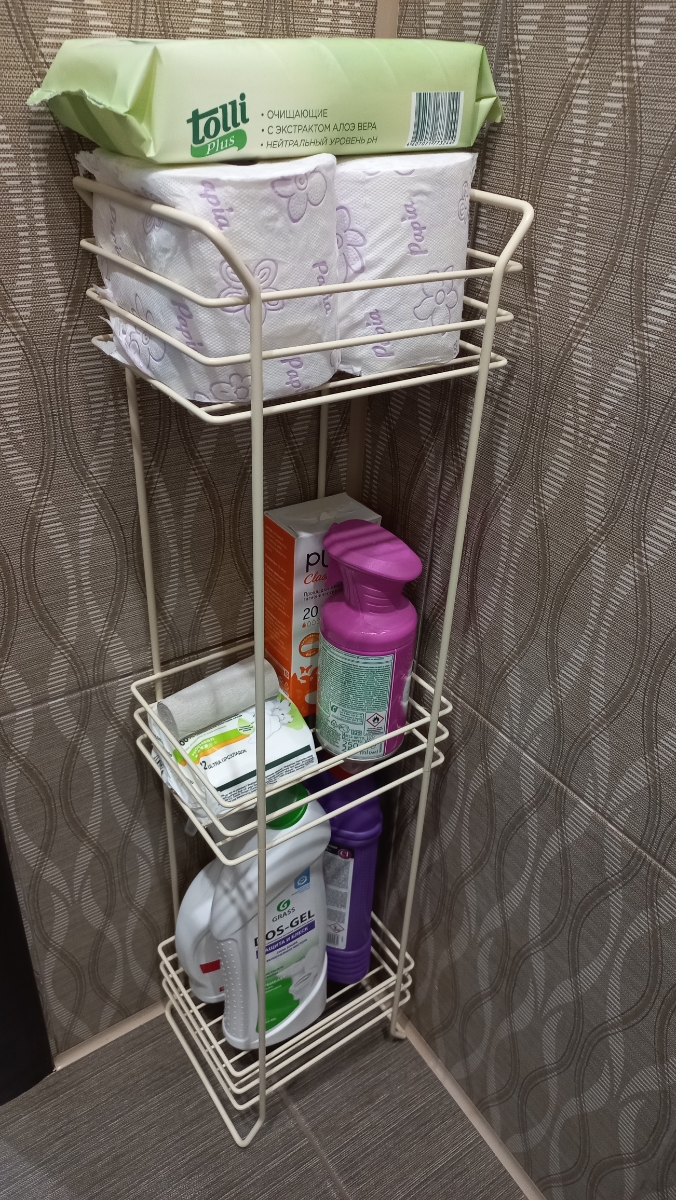 Напольный трехуровневый стеллаж. Изготовлен из прочной стали бежевого цвета. Изделие не ржавеет, выдерживает до 21 кг и не деформируется. Верхее защитное покрытие предотвращает от появления царапин и трещин и обеспечивает долгий срок службы. Российское пр