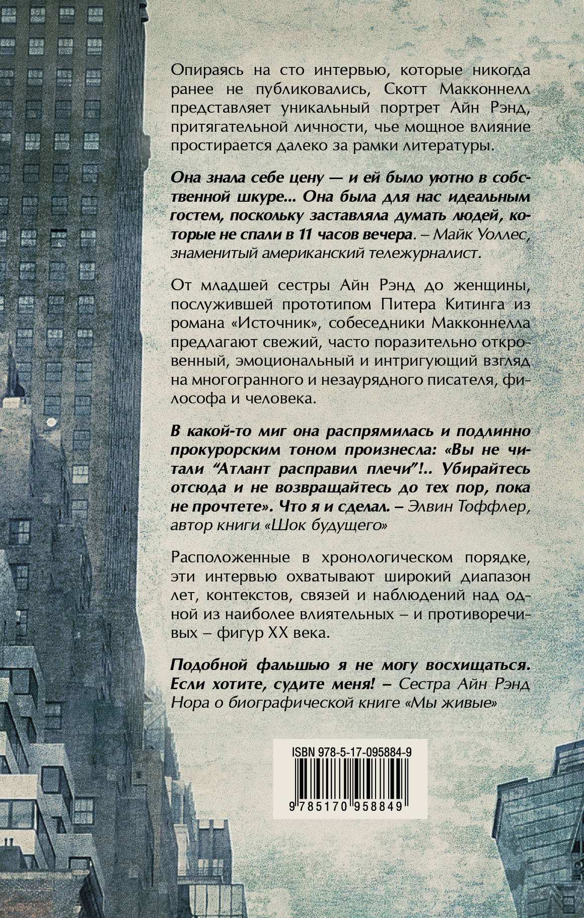 На основе сотни ранее не публиковавшихся интервью Скотт Макконнелл создает уникальный портрет Айн Рэнд, автора бестселлеров "Мы живые", "Гимн", "Источник", "Атлант расправил плечи". Сосредоточив внимание в первую очередь на частной жизни этой масштабной л