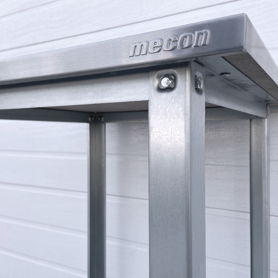 Столешница - бук, толщина 40 мм. Каркас разборный - гнутый угловой профиль, нержавеющая сталь, толщина 1,5 мм, позиционирующие пуклевки, рег. опоры, полка сплошная.