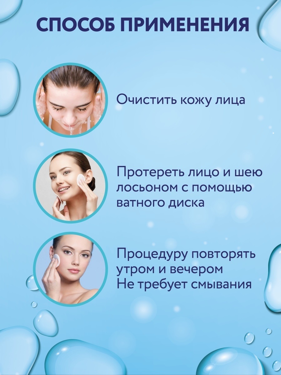 Способ применения:Каждый день после умывания, протирайте лицо и шею лосьоном с помощью ватного диска, избегая области вокруг глаз.Состав:Вода, пропиленгликоль, экстракт семян овса, бутиленгликоль, Экстракт камелии, экстракт мяты перечной, экстракт ромашки