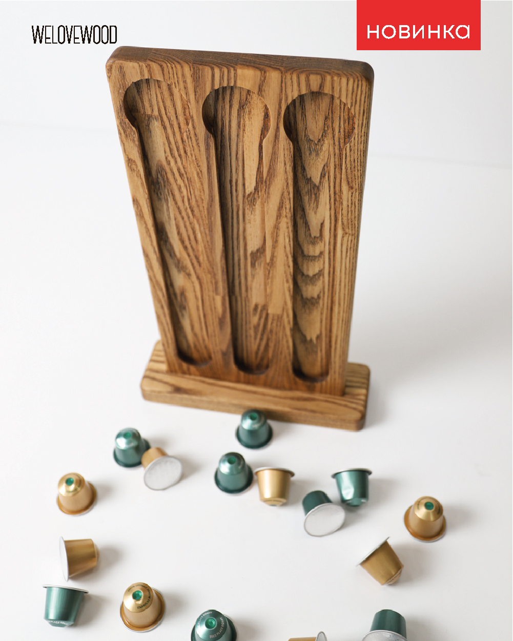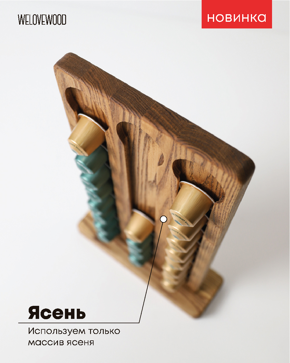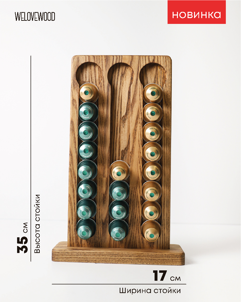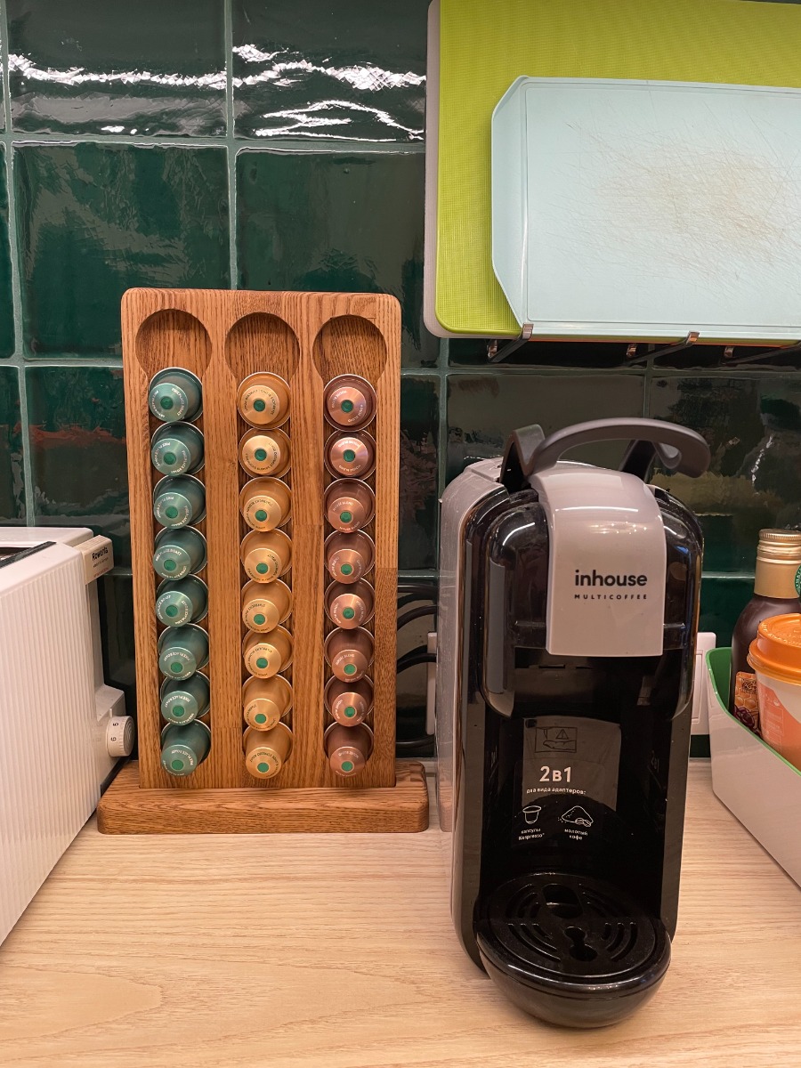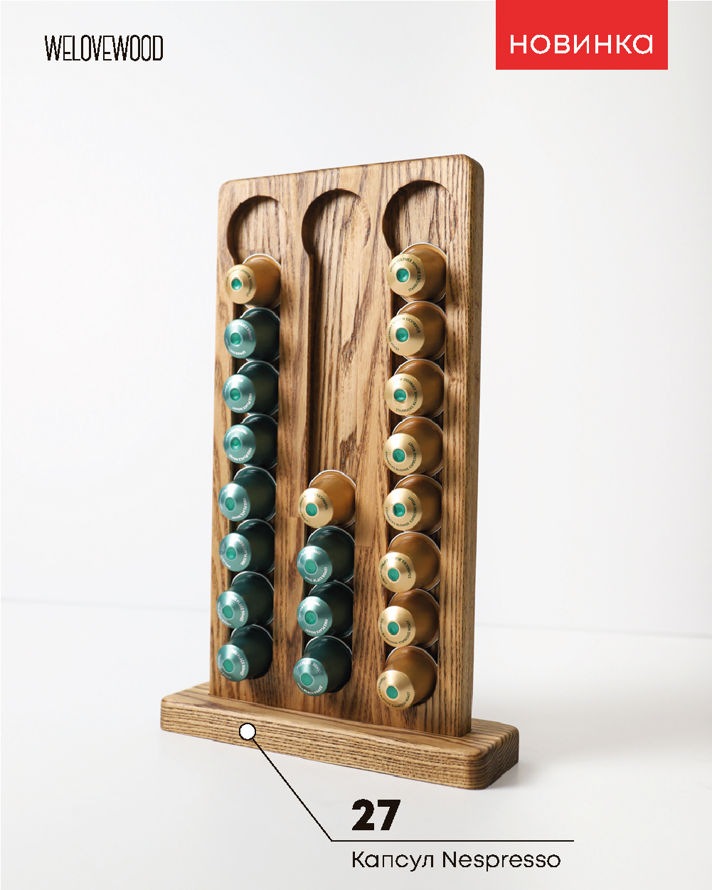 Комплектация:Основание - 1 шт;Стойка - 1 шт;Описание:Новинка 2021 года - стойка-держатель для капсул Nespresso из натурального дерева от Welovewood. Незаменимая вещь для владельцев капсульных кофемашин Nespresso. Почти все новоиспеченные владельцы капсуль