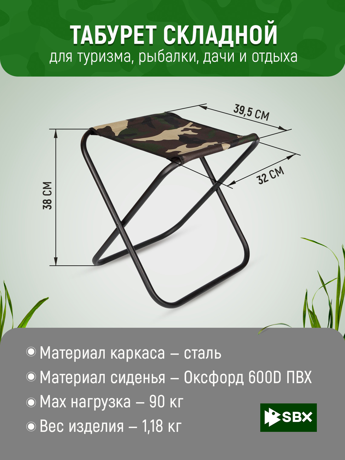 Стул складной выручит, когда нужна мобильность на местности.Размер (ДхШ): 39,5х32 см, высота 38 см.Материал каркаса: сталь.Диаметр трубы каркаса: 16 мм.Толщина стенки трубы каркаса: 1 мм.Покрытие каркаса: полимерное.Материал сиденья/спинки: Оксфорд 600D П
