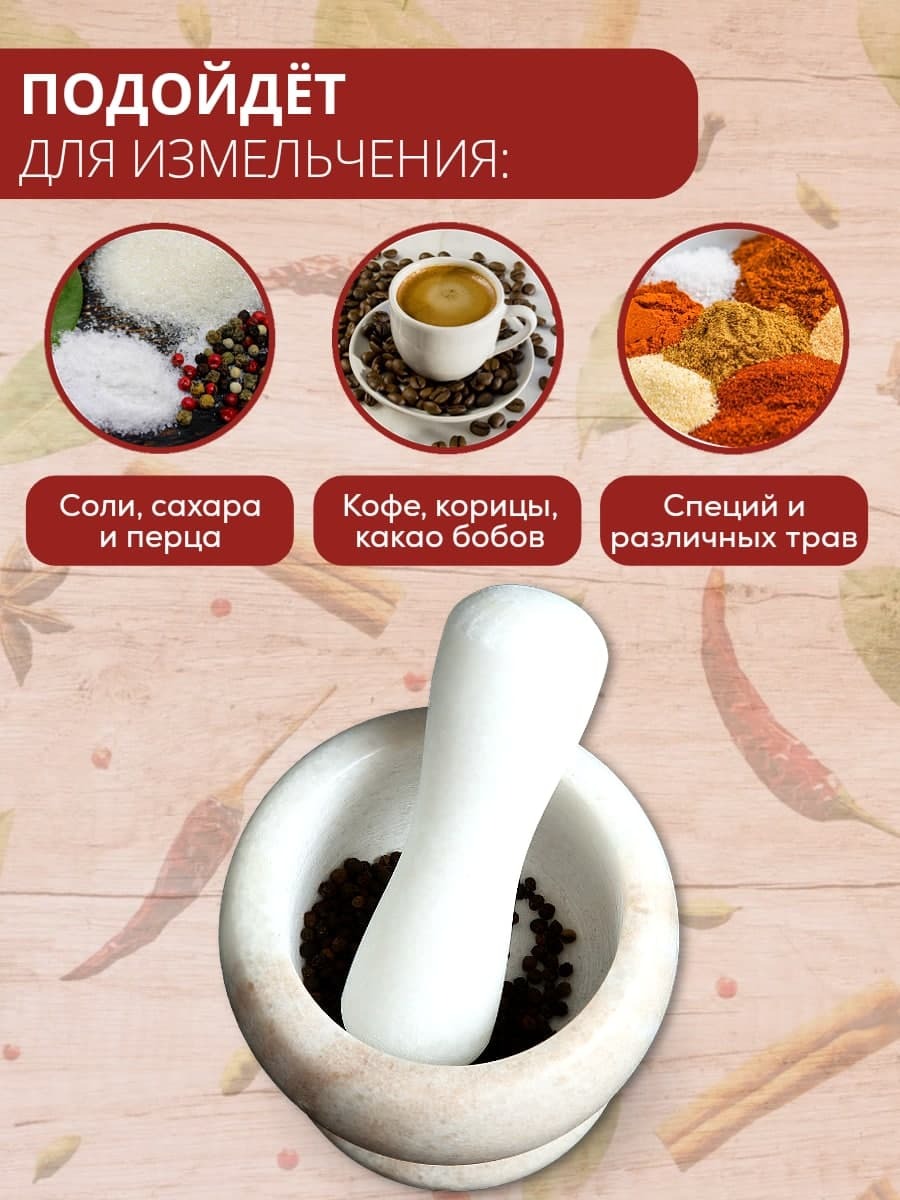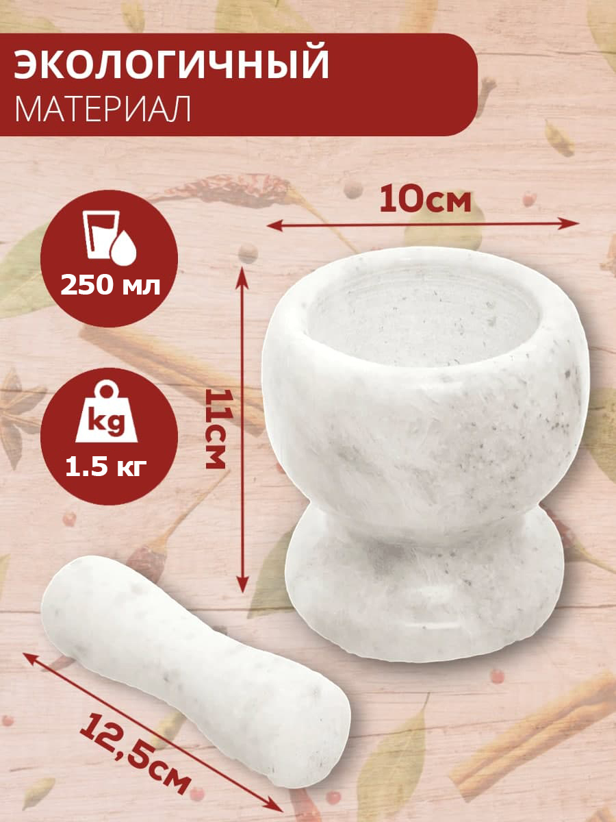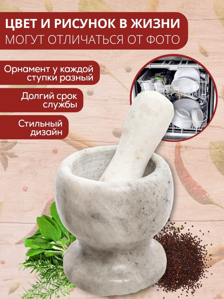 Комплектация:Ступка с пестиком - 1 штОписание:Ступка каменная с пестиком изготовлена из мрамора и предназначена для измельчения специй. Поскольку мрамор является природным материалом, натуральный камень имеет индивидуальный орнамент, поэтому оттенок может