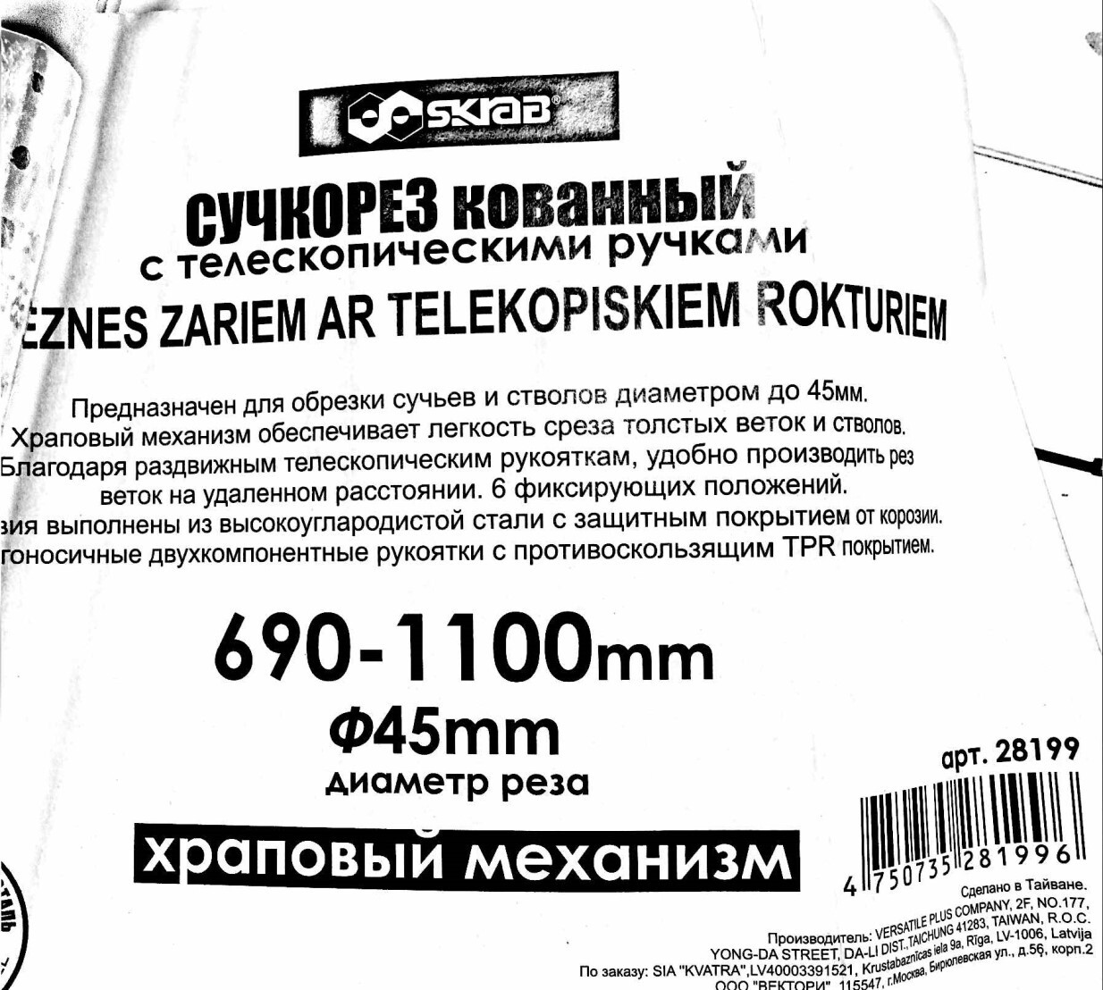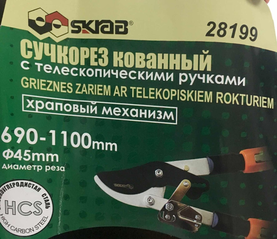 ОсобенностиНескользящее покрытие рукоятки, Регулируемая ручка, Металлическое лезвие, Многокомпонентная ручка, Храповый механизм