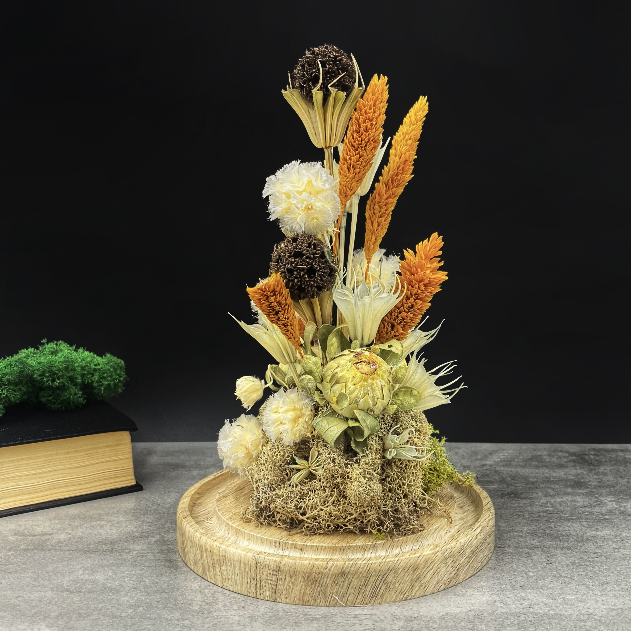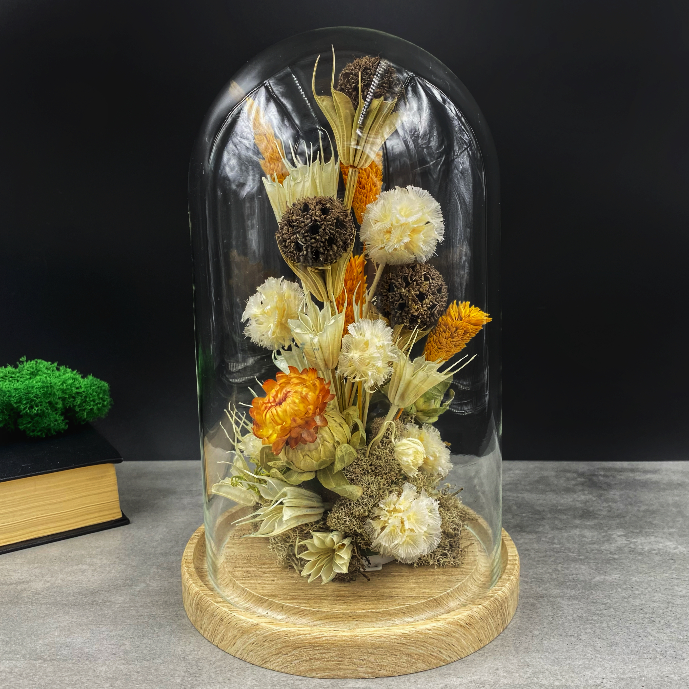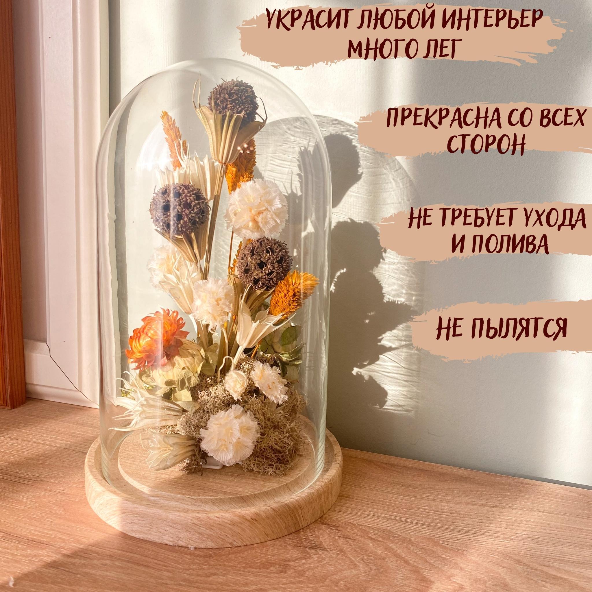 Композиция из сухоцветов и стабилизированного мха в колбе RozaRose с флористическими тенденциями никого не оставить равнодушным, будет уникальным подарком и стильно смотреться в любом интерьере!Клош из сухоцветов ярко выделяется на фоне традиционных компо