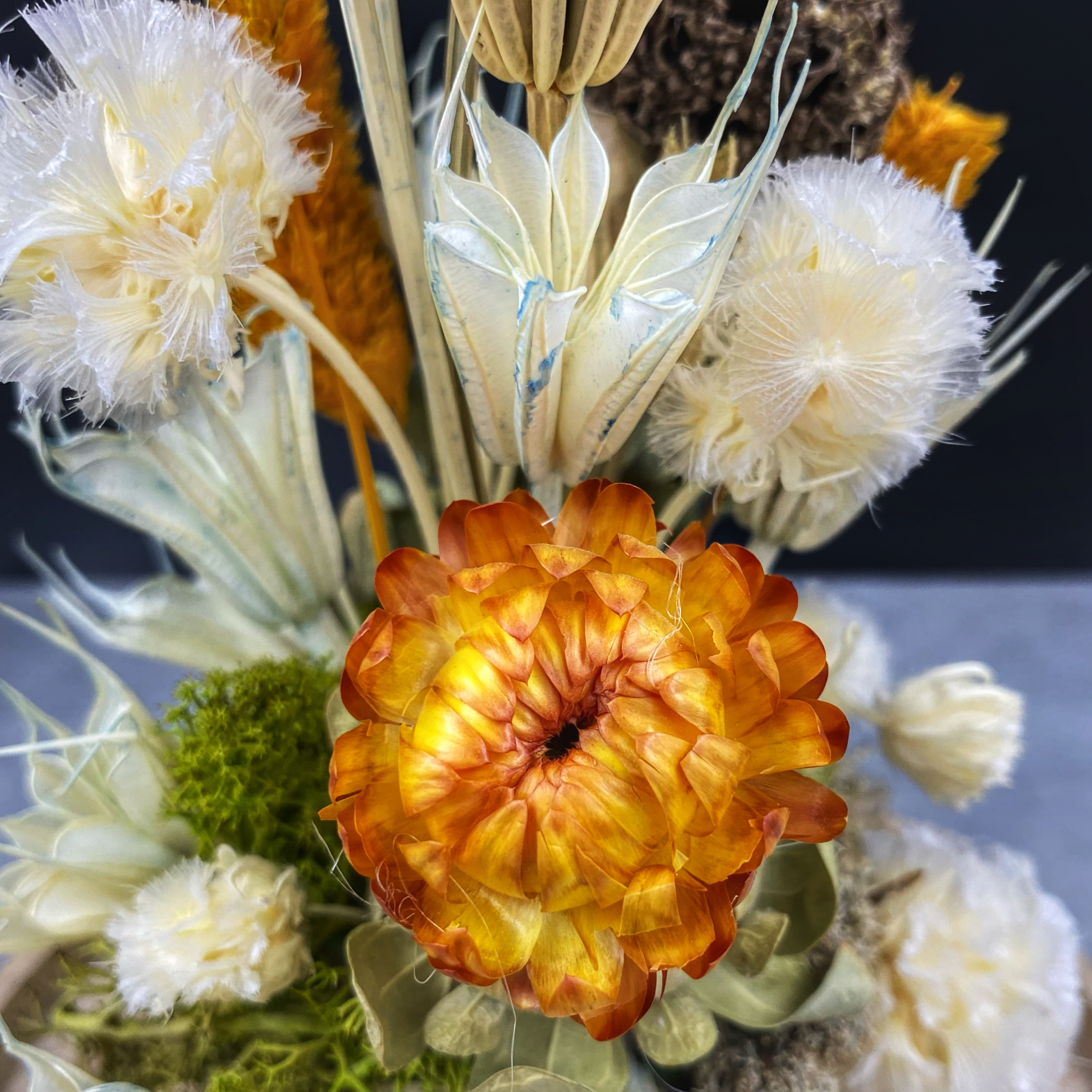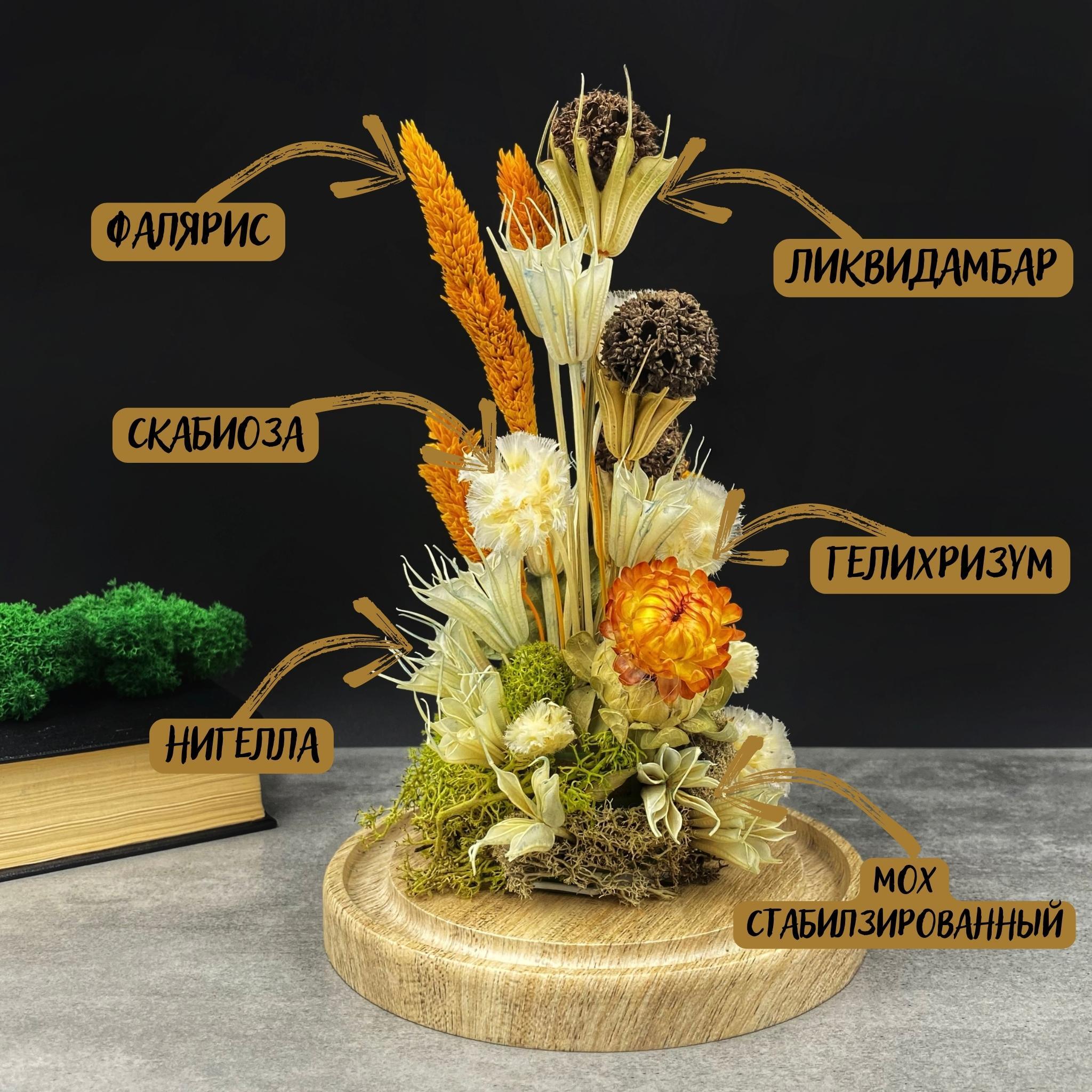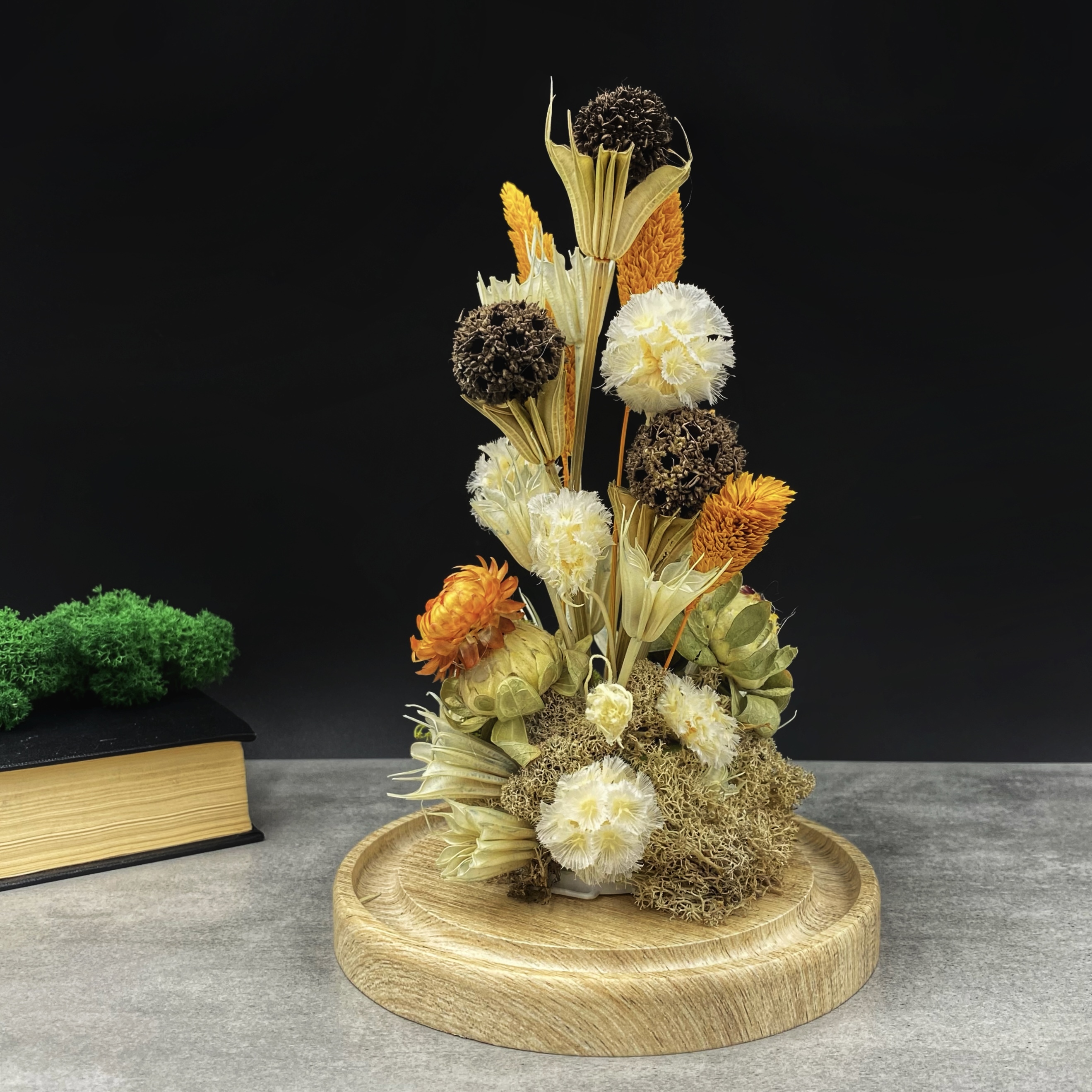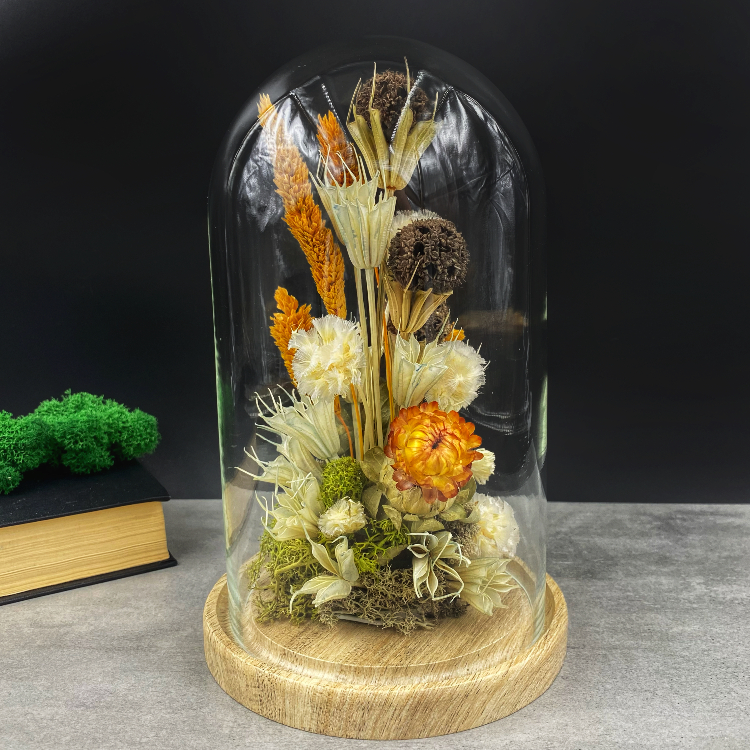 Композиция из сухоцветов и стабилизированного мха в колбе RozaRose с флористическими тенденциями никого не оставить равнодушным, будет уникальным подарком и стильно смотреться в любом интерьере!Клош из сухоцветов ярко выделяется на фоне традиционных компо