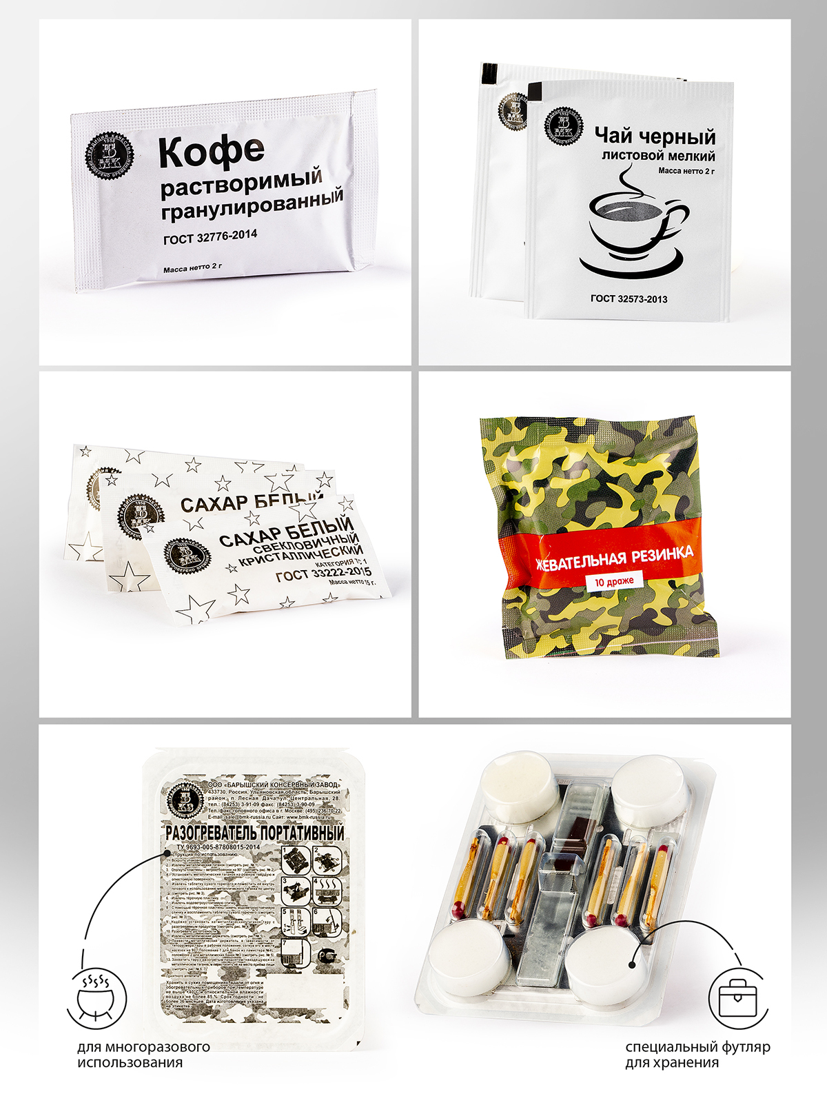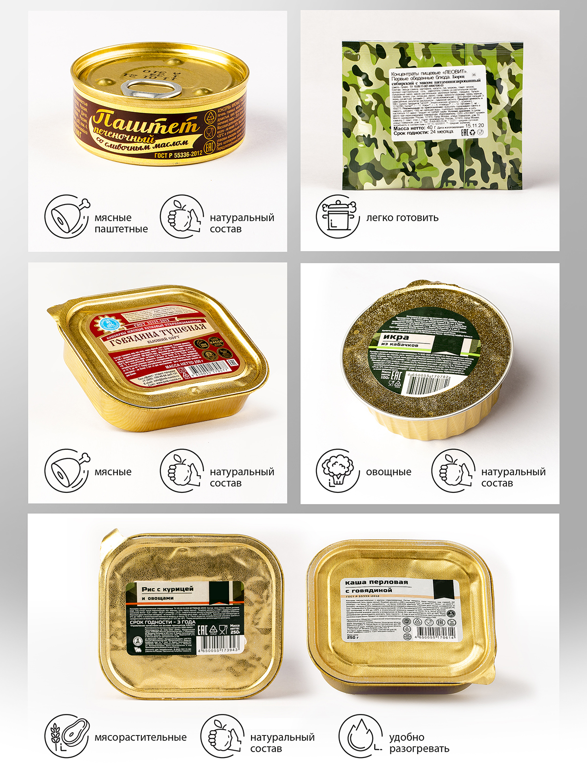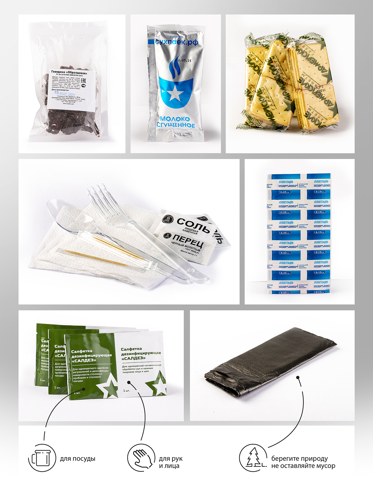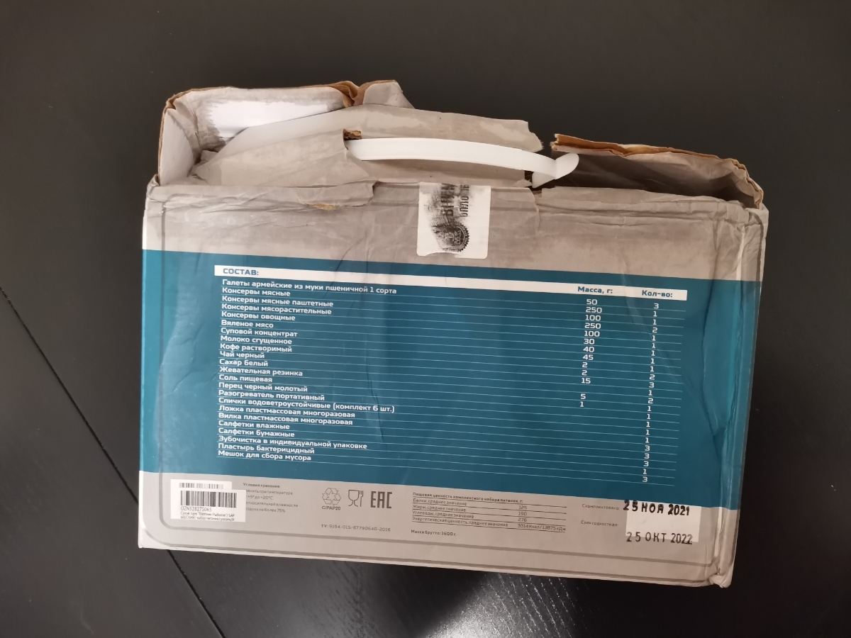 Условия хранения:Хранить при температуре от 5 до 20 °C и относительной влажности воздуха не более 75%Состав:галеты армейские из муки пшеничной 1 сорта 50гх3шт, консервы мясные 250гх1шт,консервы мясные паштетные 100гх1шт, консервы мясорастительные 250гх2ш