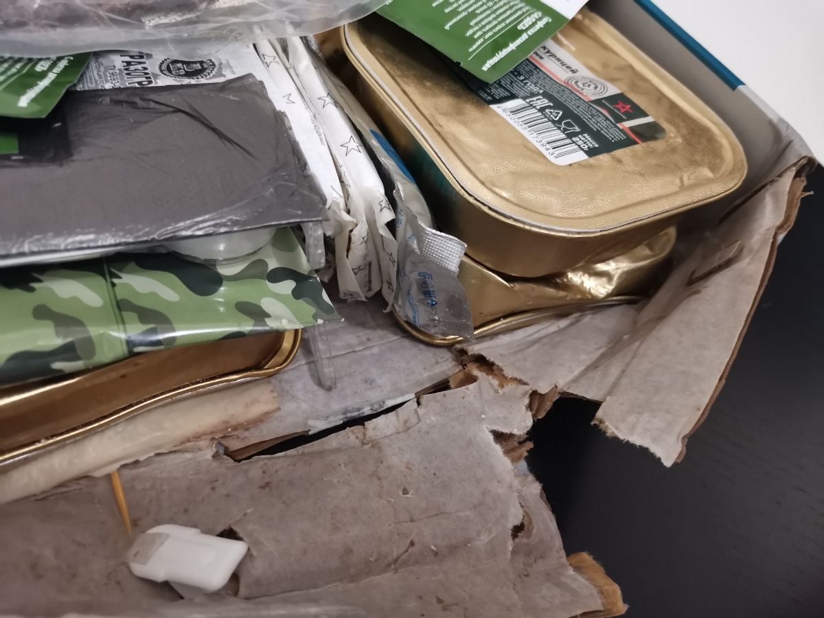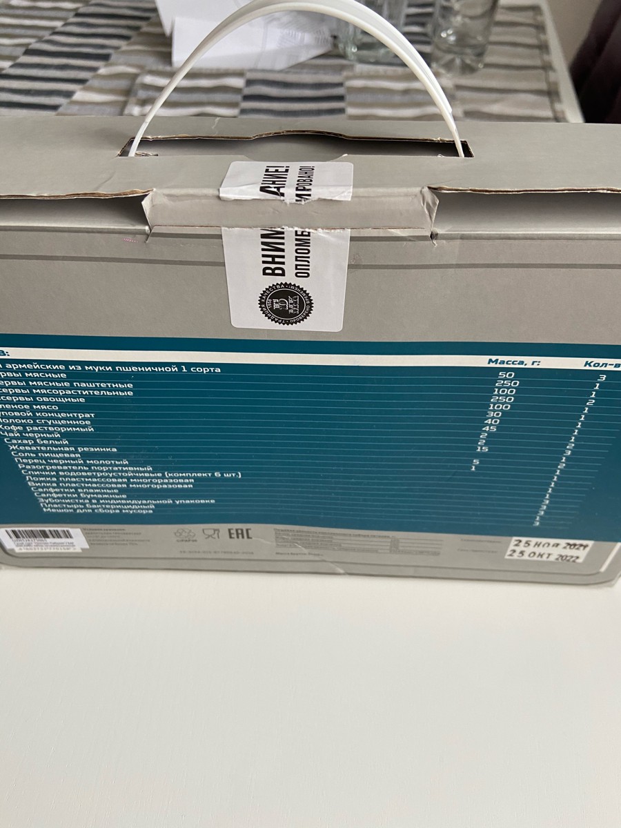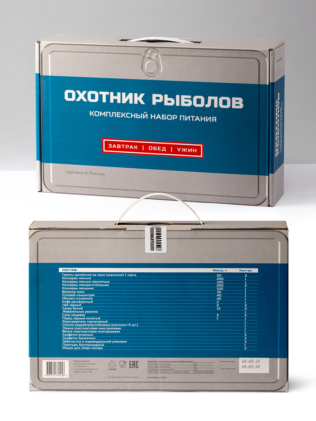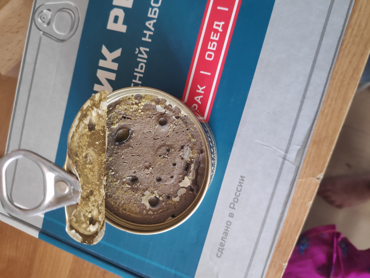 Условия хранения:Хранить при температуре от 5 до 20 °C и относительной влажности воздуха не более 75%Состав:галеты армейские из муки пшеничной 1 сорта 50гх3шт, консервы мясные 250гх1шт,консервы мясные паштетные 100гх1шт, консервы мясорастительные 250гх2ш
