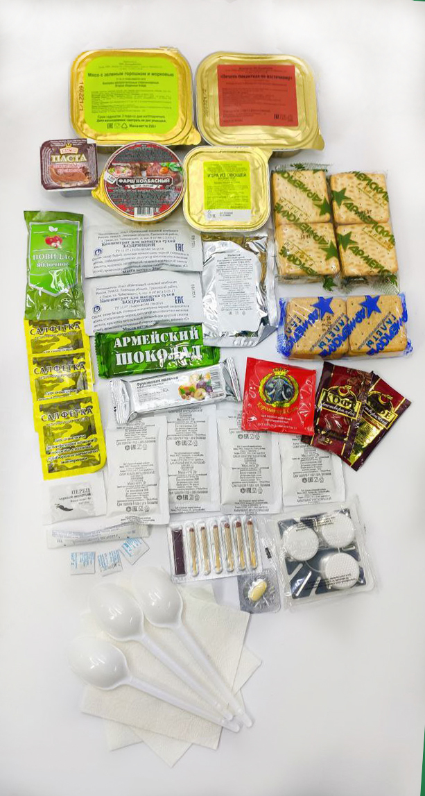 Суточный рацион питания. Отличный подарок на 9 мая, а также для охотников, рыболовов, для походов. Сухой паёк "СМЕРШ" содержит суточный богато сбалансированный рацион питания позволяющий не остаться голодным в любых экстремальных ситуациях. Сухпаек Ирптор