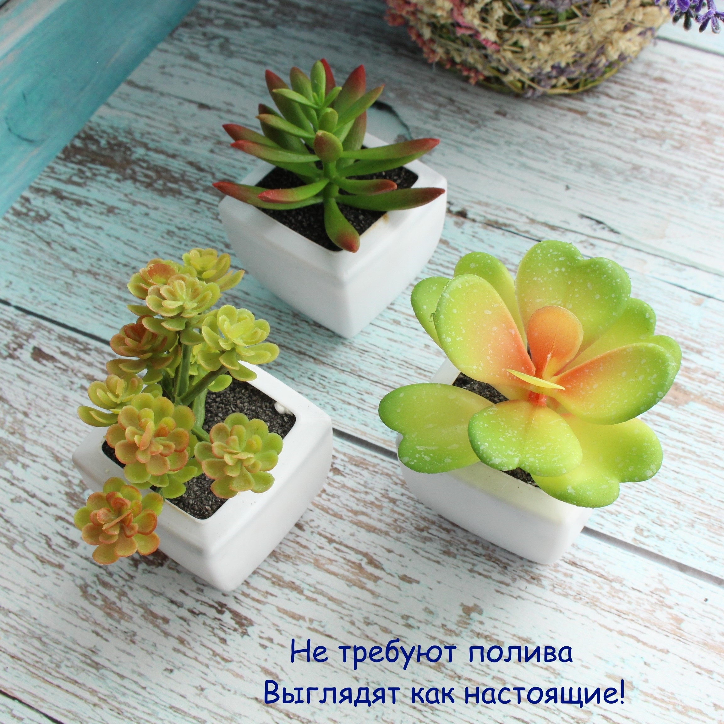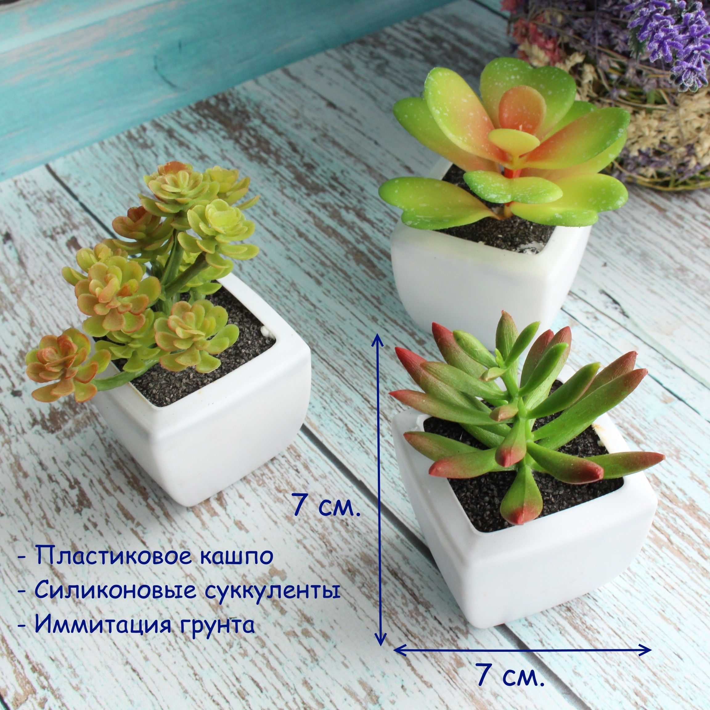Комплектация:Суккуленты искусственные в пластиковом кашпо - 3 шт.Описание:Искусственные небольшие (7х7 см.) суккуленты в ваш дом. Суккуленты в небольших горшочках украсят ваш интерьер, расставят акценты в нужных местах, "оживят" углы и полки или станут хо