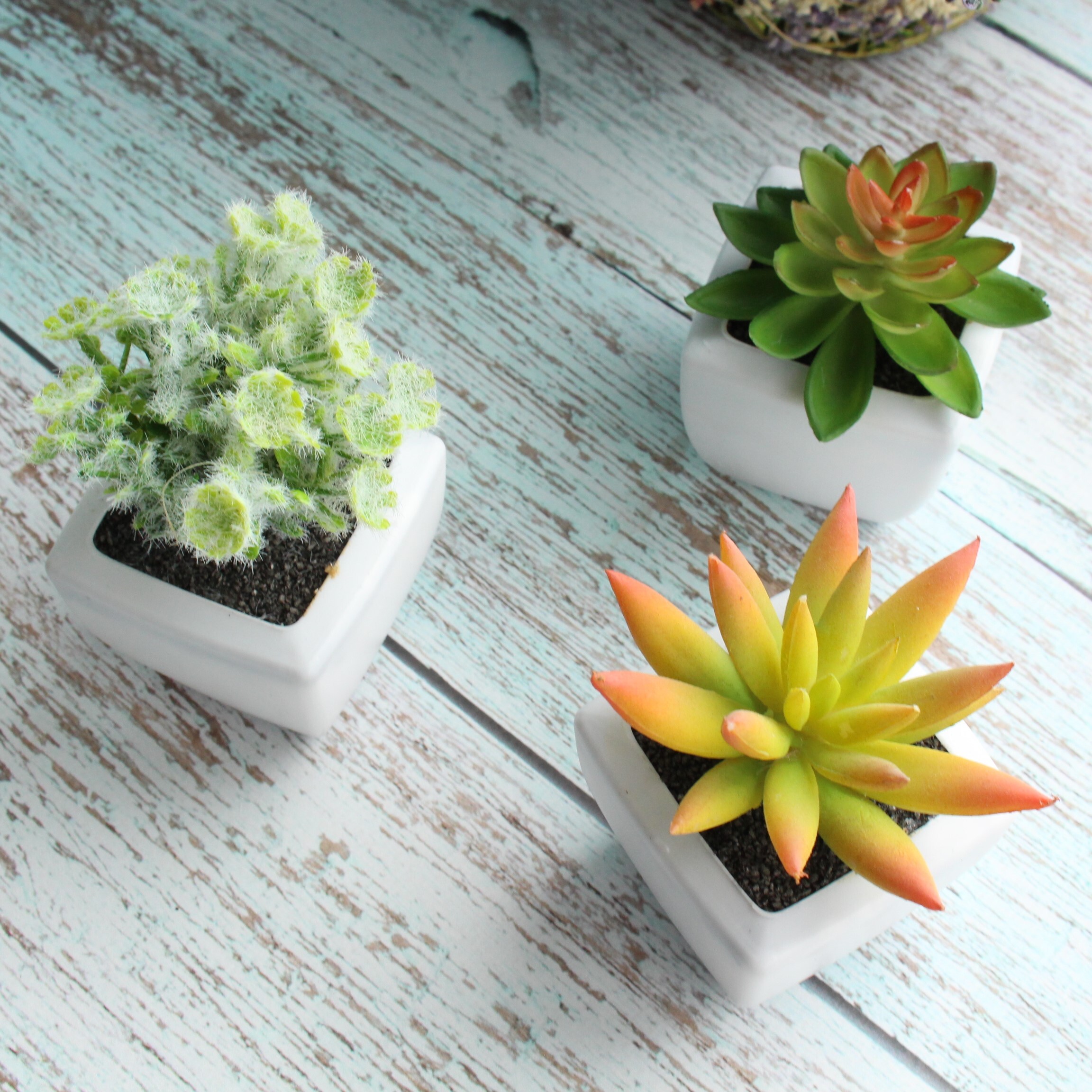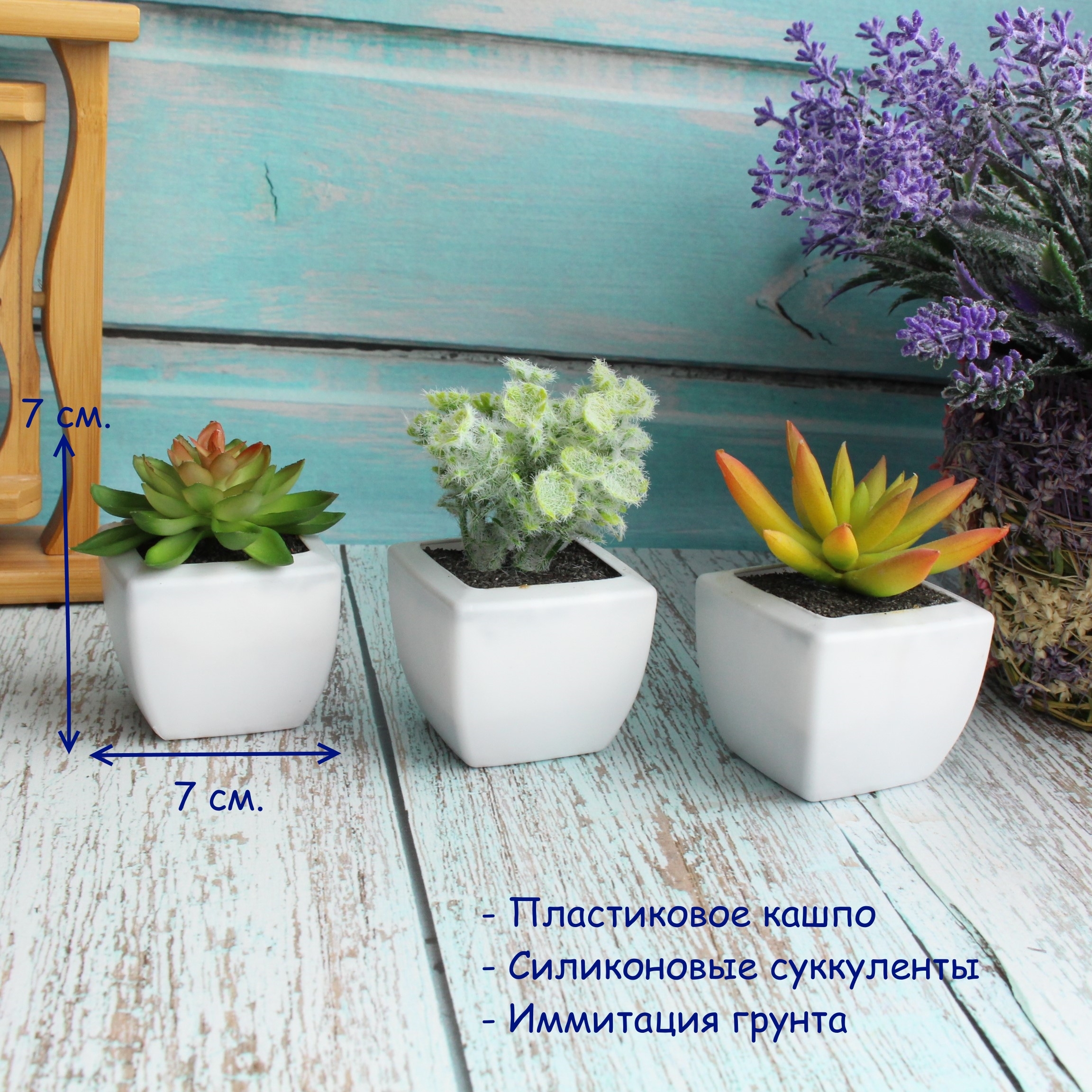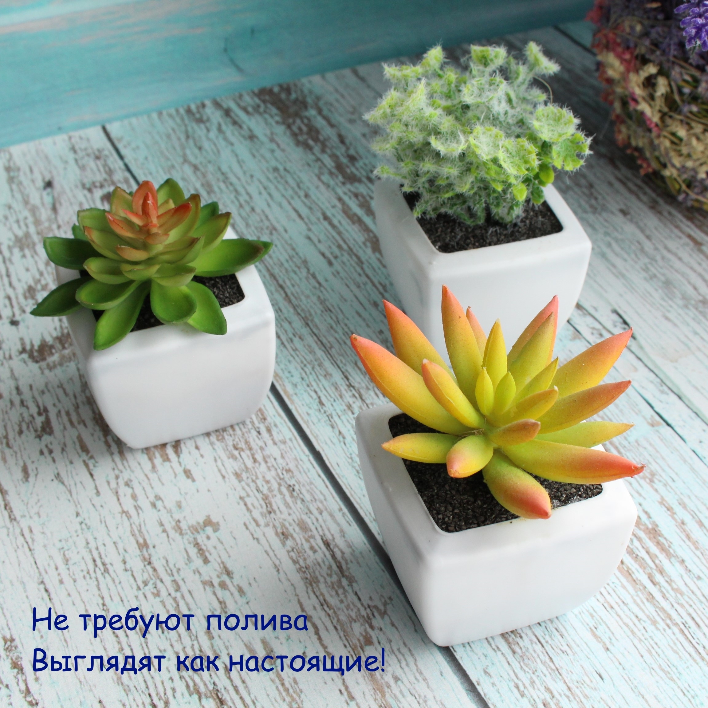 Искусственные небольшие (7х7 см.) суккуленты в ваш дом. Суккуленты в небольших горшочках украсят ваш интерьер, расставят акценты в нужных местах, "оживят" углы и полки или станут хорошим украшением обеденного стола.Комплектация:Суккуленты искусственные в